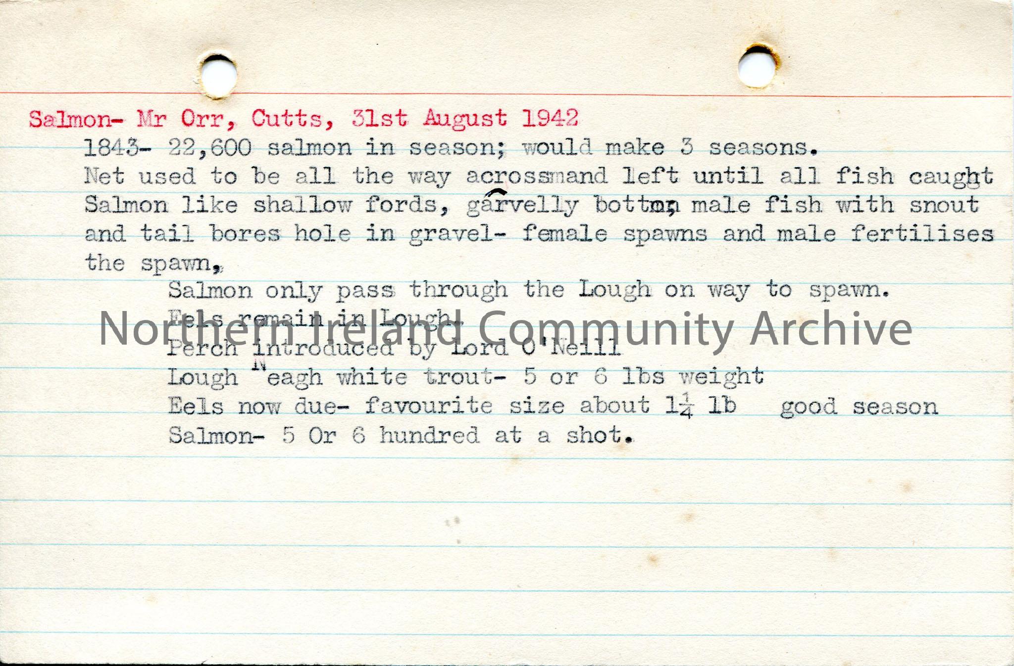 Typed notes re salmon and eels – in 1843, 22600 salmon in season and other information