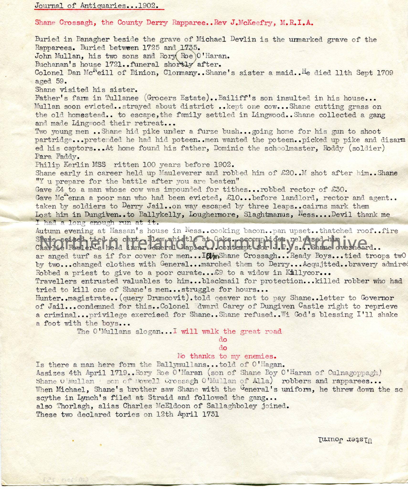 Typed notes re Shane Crossagh from the Journal of Antiquaries, 1902. Title ‘Shane Crossagh, the County Derry Rapparee..Rev J. McKeefry, M.R.I.A.