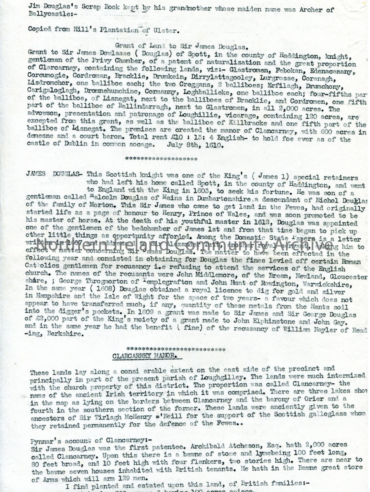 Typed notes re Sir James Douglas. Sent with letter CM:2018:572.1.