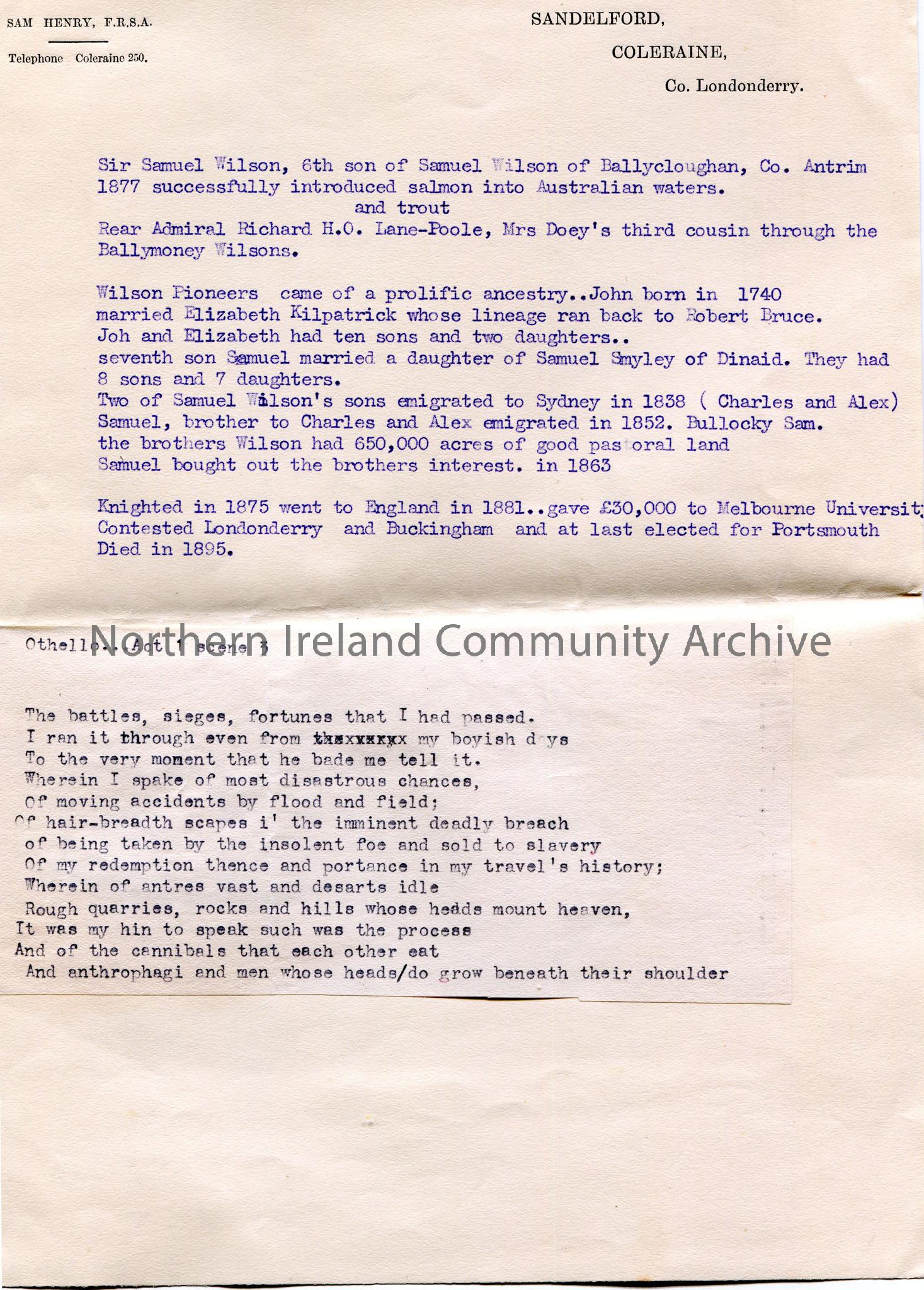 Typed notes re Sir Samuel Wilson, 6th son of Samuel Wilson of Ballycloughan, Co. Antrim and other notes re Wilson family. Includes Act 1 Scene 3 of Othello.