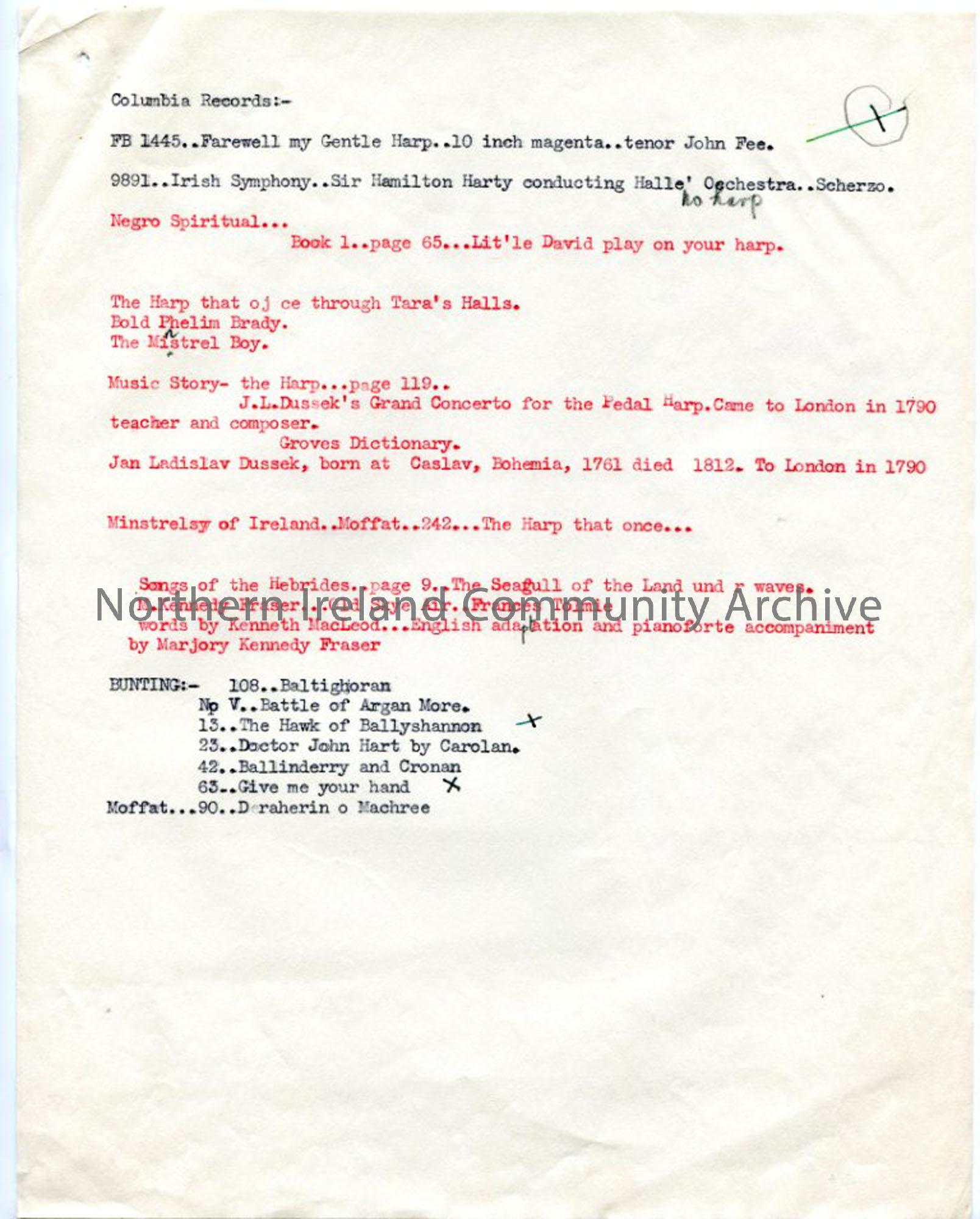 Typed notes re: song titles. Heading – ‘Columbia Records’
