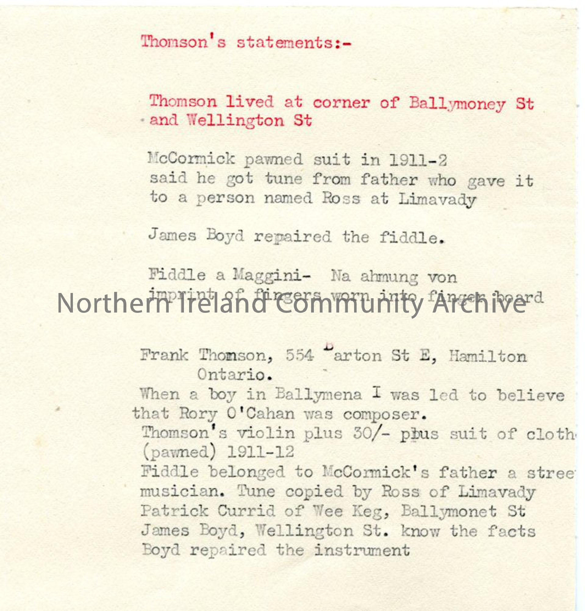 Typed notes re: 'Thomson's statement' - appears to be notes extracted from letters received from Frank Thomson re Londonderry Air, Rory Dall O'Cahan and McCormick the fiddler.