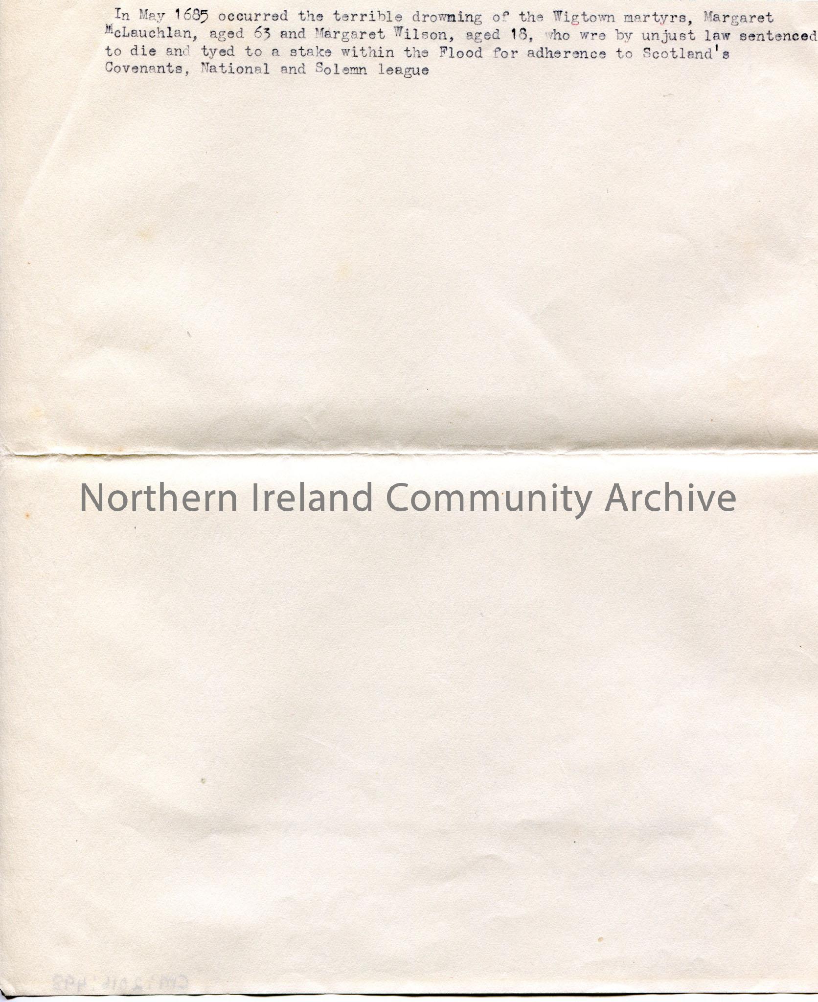 Typed notes re Wigtown martyrs- Margaret McLauchlan and Margaret Wilson who were drowned and tied to a stake.