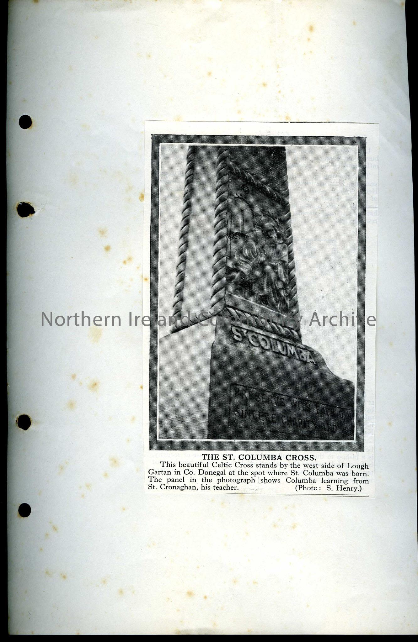Typed notes regarding St. Columba and a photograph of the St. Columba Cross that stands bynthe west side of Lough Gartan in Co. Donegal.
