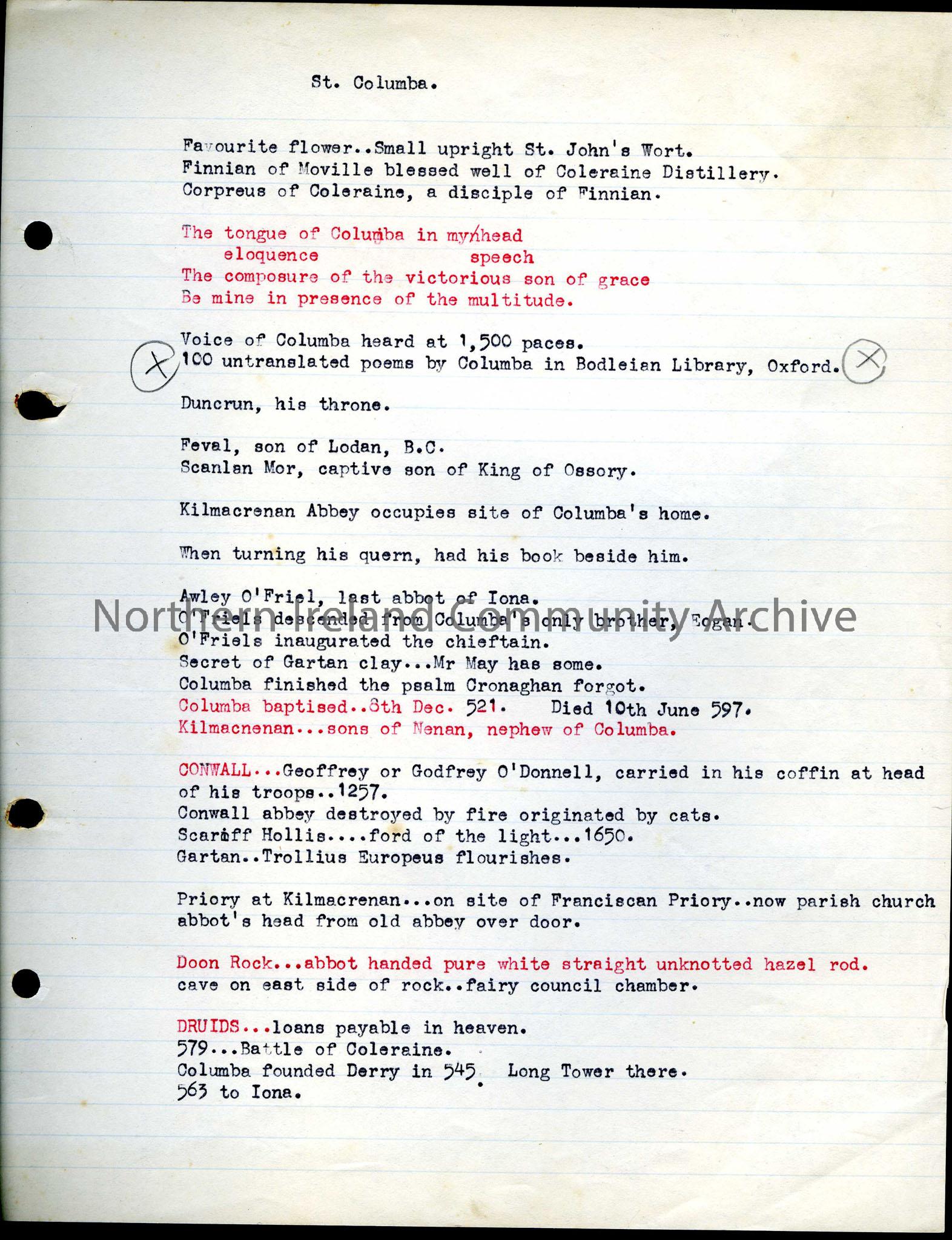 Typed notes regarding St. Columba and a photograph of the St. Columba Cross that stands bynthe west side of Lough Gartan in Co. Donegal.