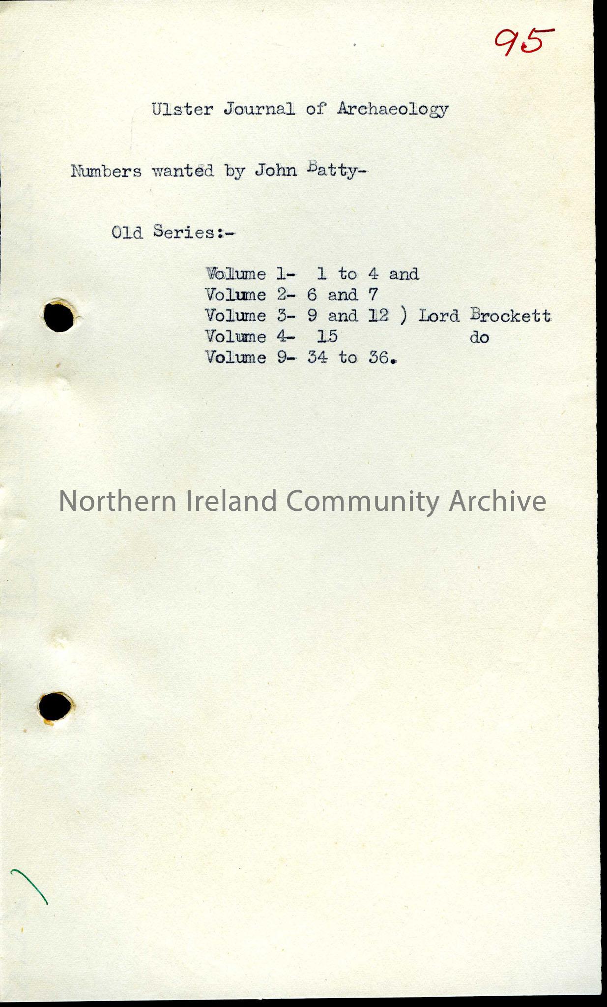 Typed notes regarding Ulster Journal of Archaeology volumes wanted by John Batty.