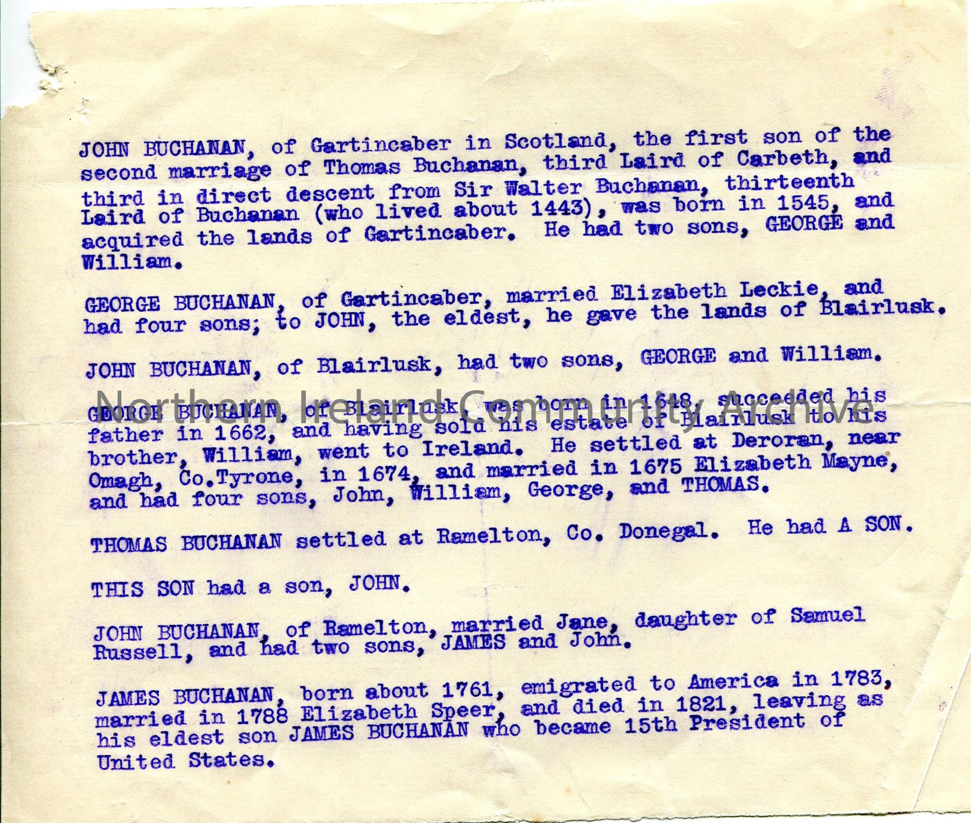 Typed notes relating to Buchanan family, from Scottish origins in 15th century to removal to Ireland in 17th and James Buchanan becoming 15th President of United States in 19th century