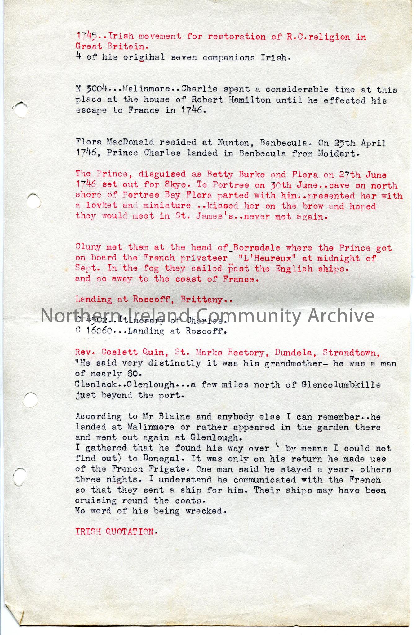 Typed notes relating to Prince Charlie's Irish companions, alleged time in Donegal, Flora MacDonald, escape.