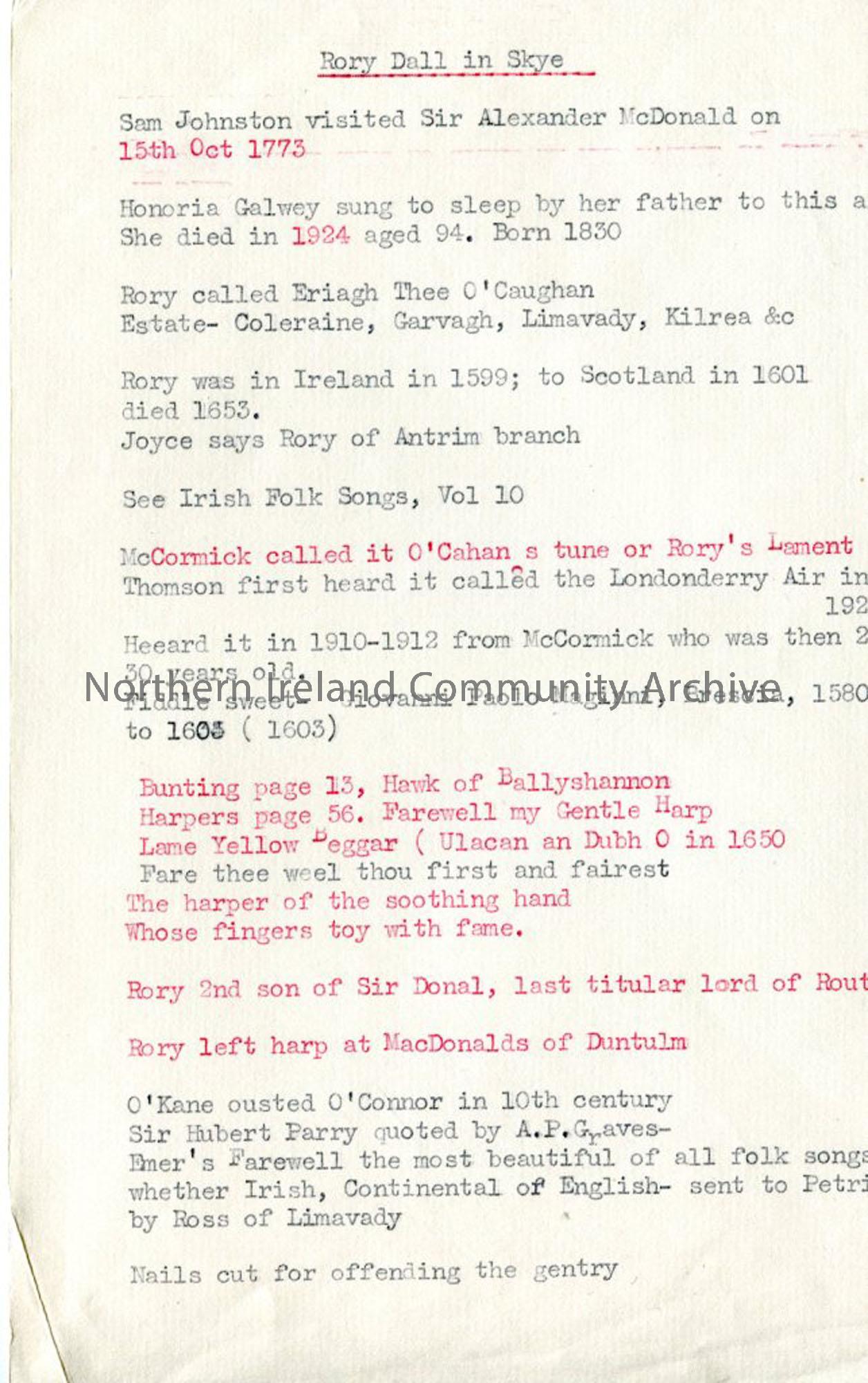 Typed notes – ‘Rory Dall in Skye’