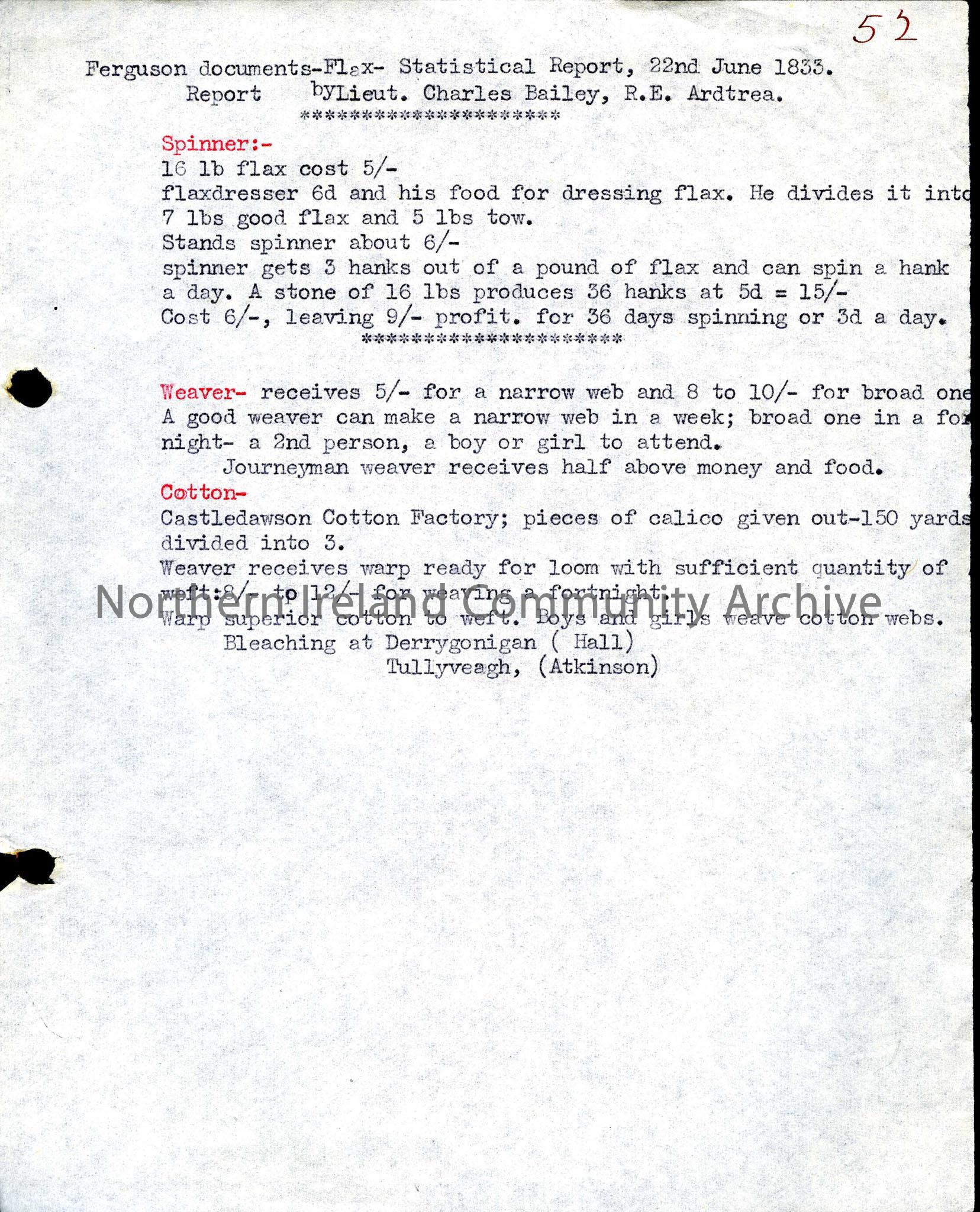Typed notes seemingly transcribed from Ferguson Documents-Flax-Statistical report, 22.06.1833, outlining costs and pay involved in flax production.