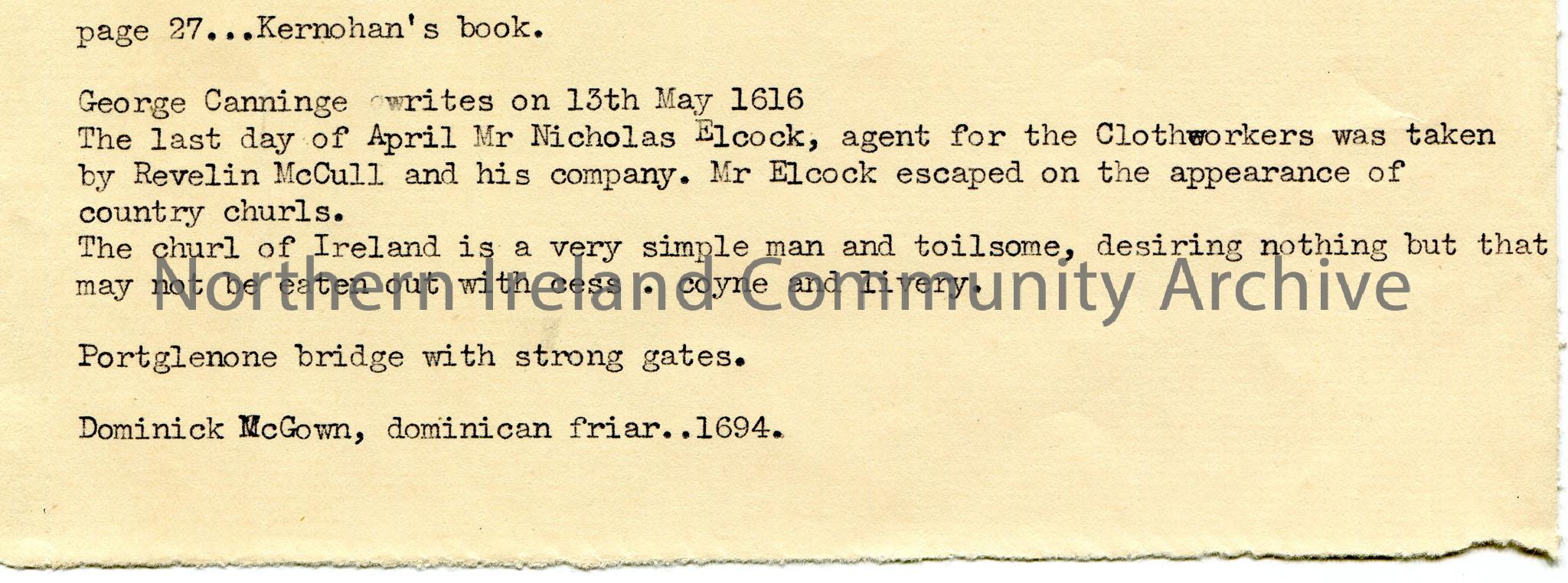 Typed notes taken from page 27 of Kernohan’s book. Re the escape of Mr Elcock, agent for the Clothworkers. Mentions Dominick McGown, dominican friar, …