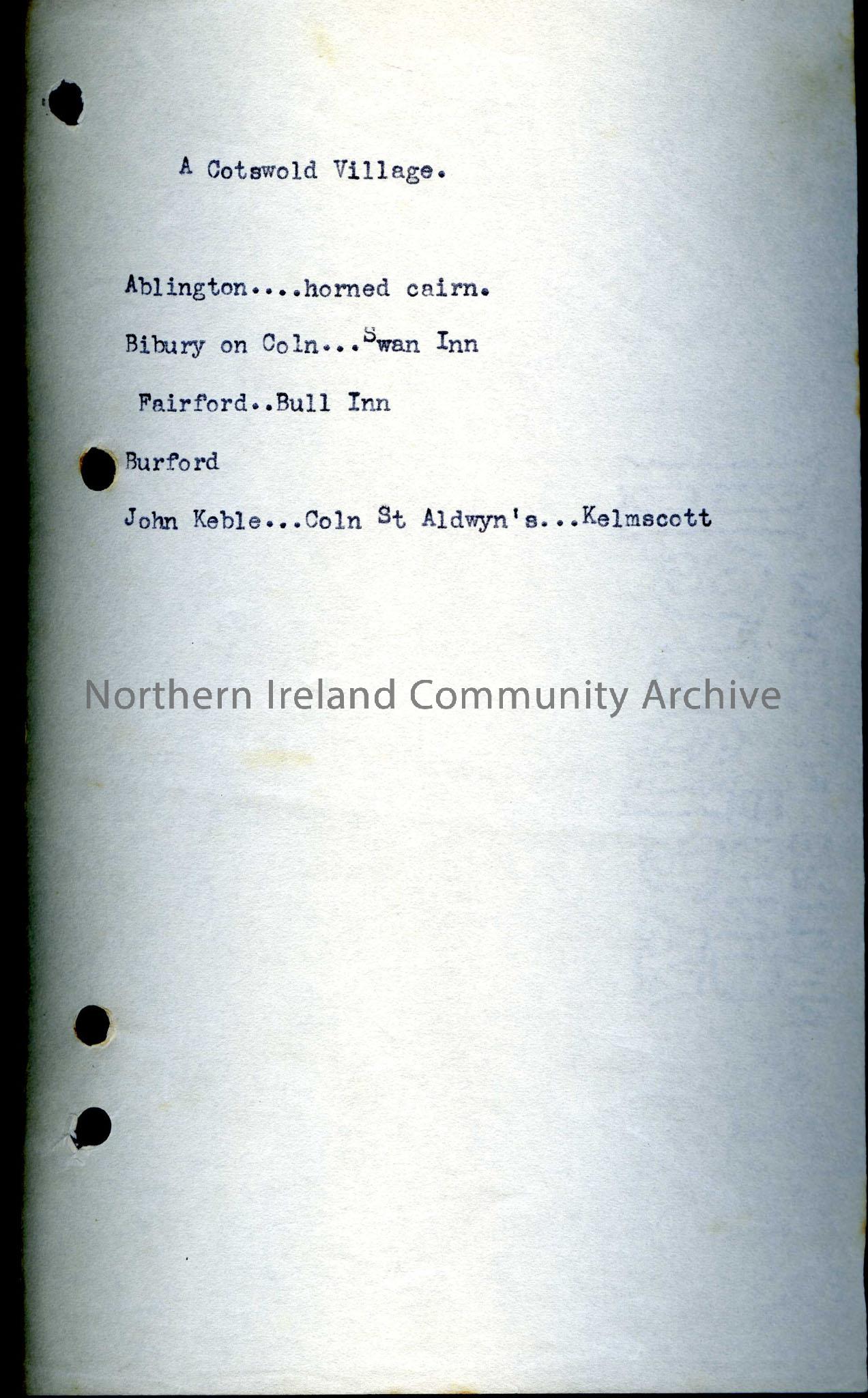 Typed notes, titled ‘A Cotswold Village’.