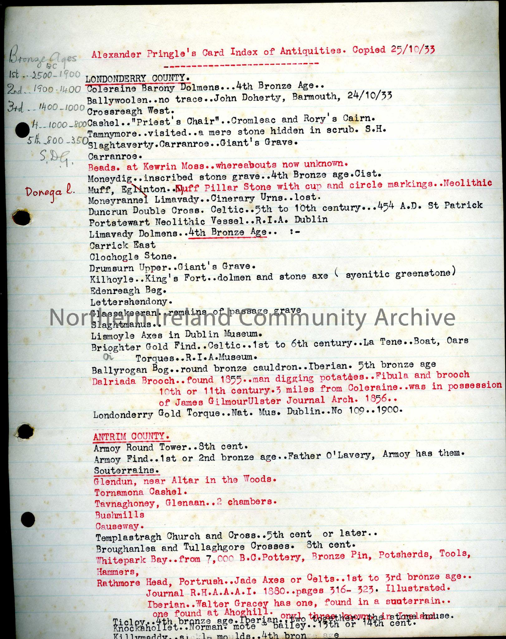 Typed notes titled: Alexander Pringle's Card Index of Antiquities. Copied 25.10.1933. Notes under County Londonderry and County Antrim.