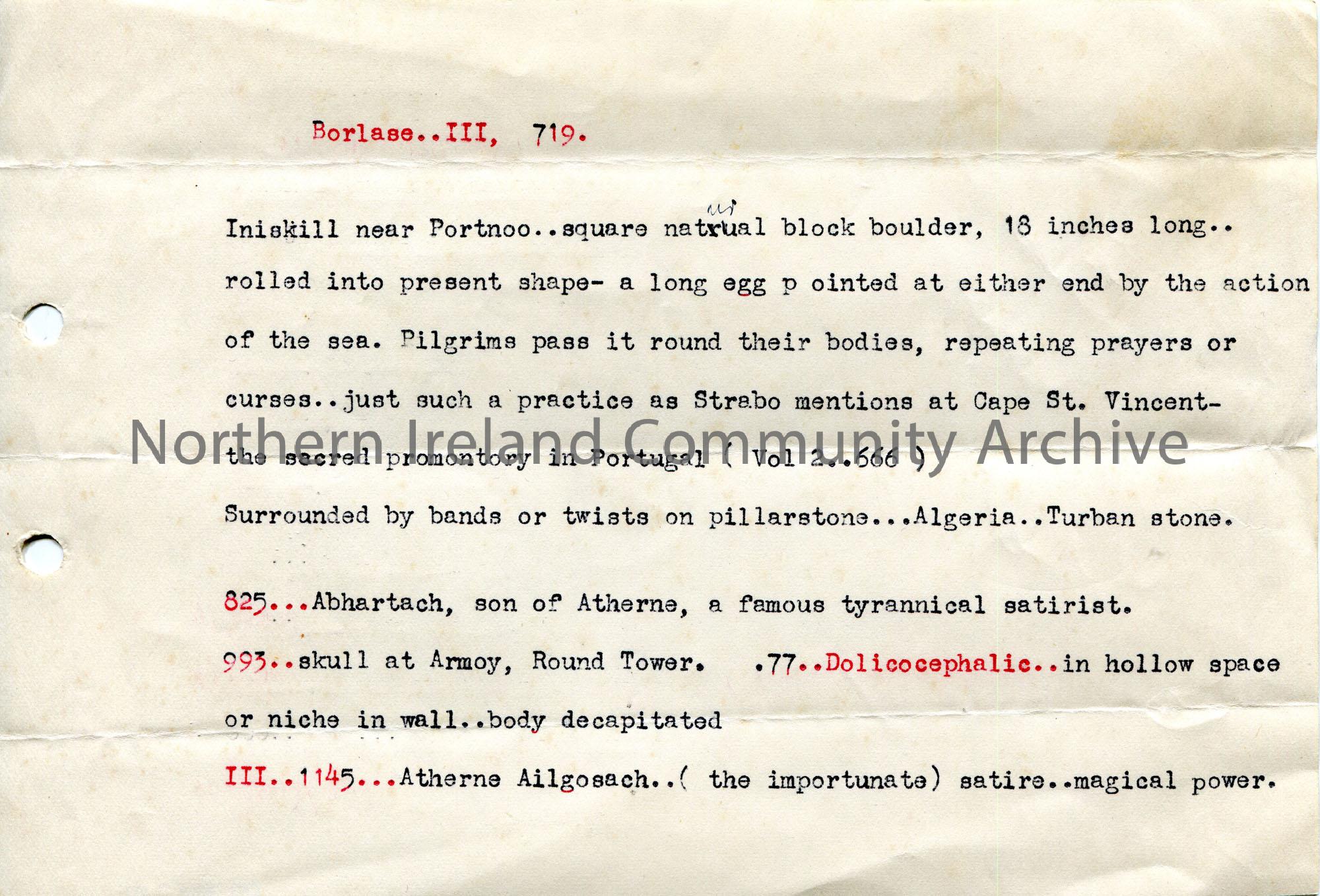 Typed notes titled, ‘Borlase..III, 719’. Re boulder at Iniskill near Portnoo. Also mentions skull found at Armoy, Round Tower.