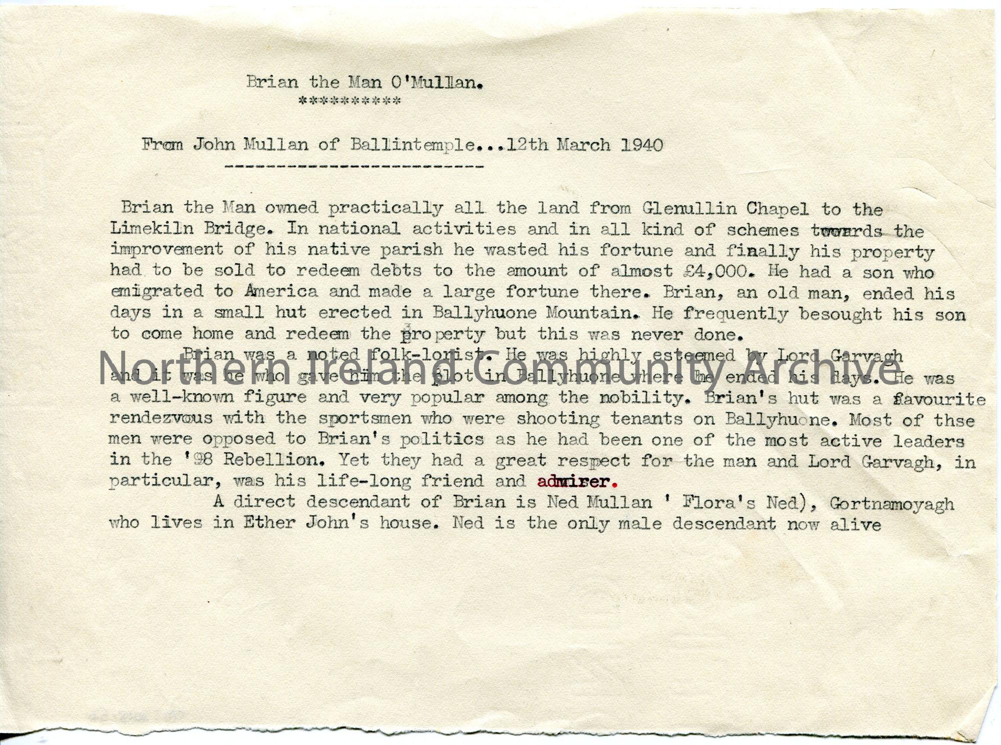 Typed notes titled, ‘Brian the Man O’Mullan. From John Mullan of Ballintemple…12th March 1940’. Notes him as a folklorist.