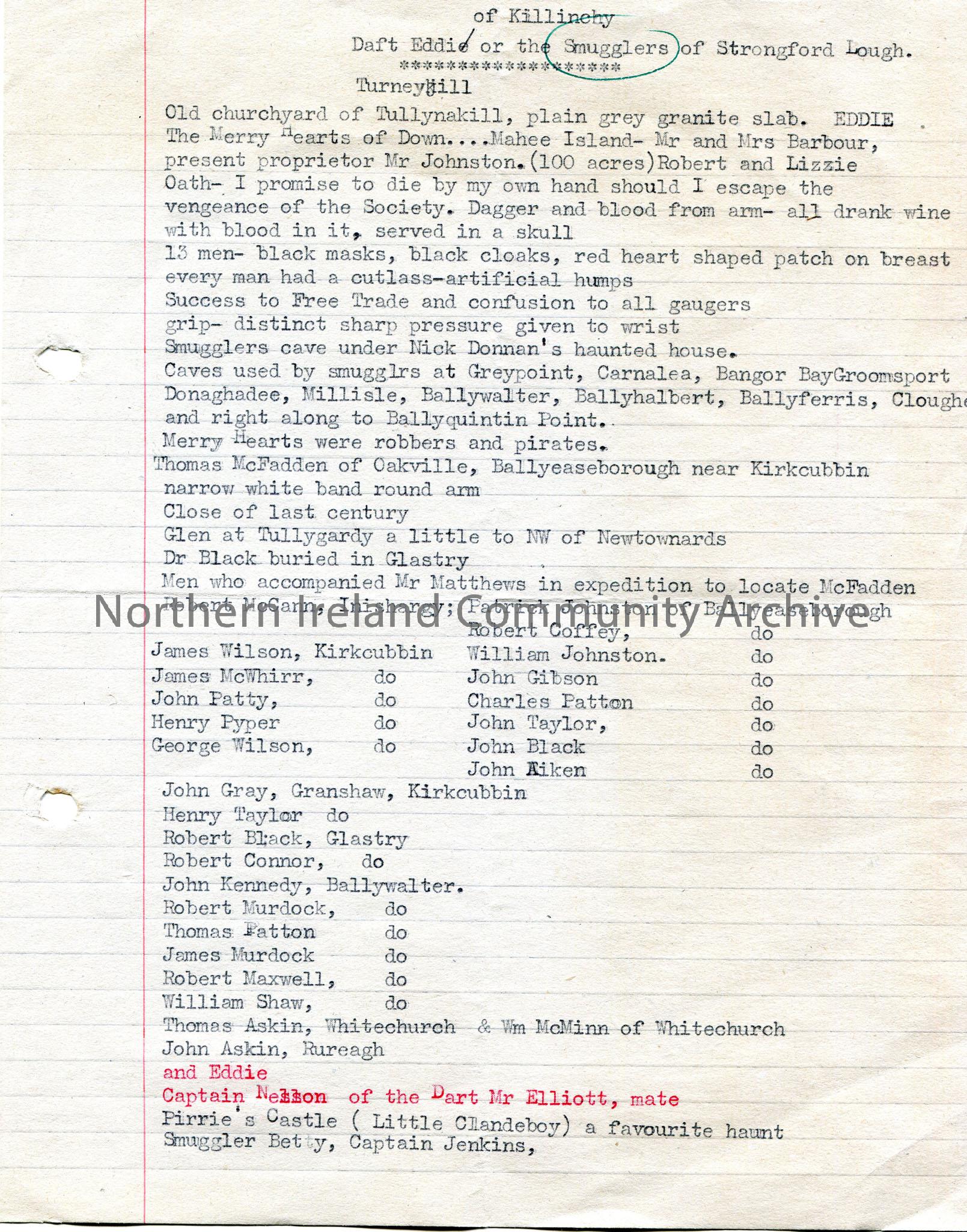 Typed notes titled, ‘Daft Eddie of Killinchy or the Smugglers of Strangford Lough’.