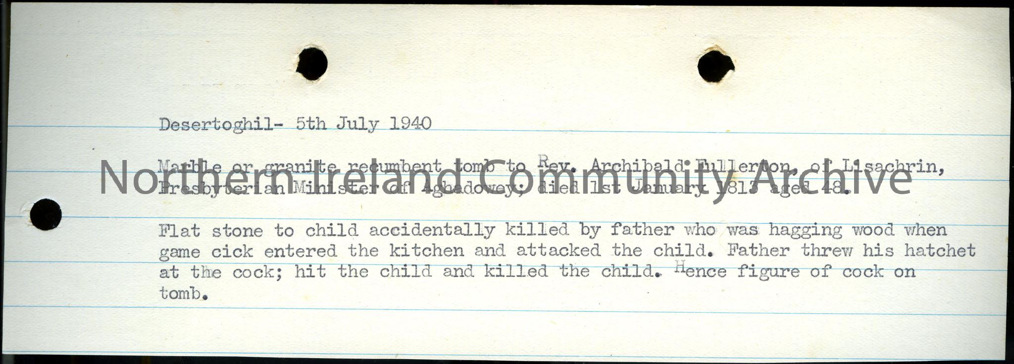 Typed notes titled Desertoghil, 5th July 1940. Mentions Rev. Archibald Fullerton of Lisachrin who died 1st January 1813, William Rafferty of Glenullin… – Scan147