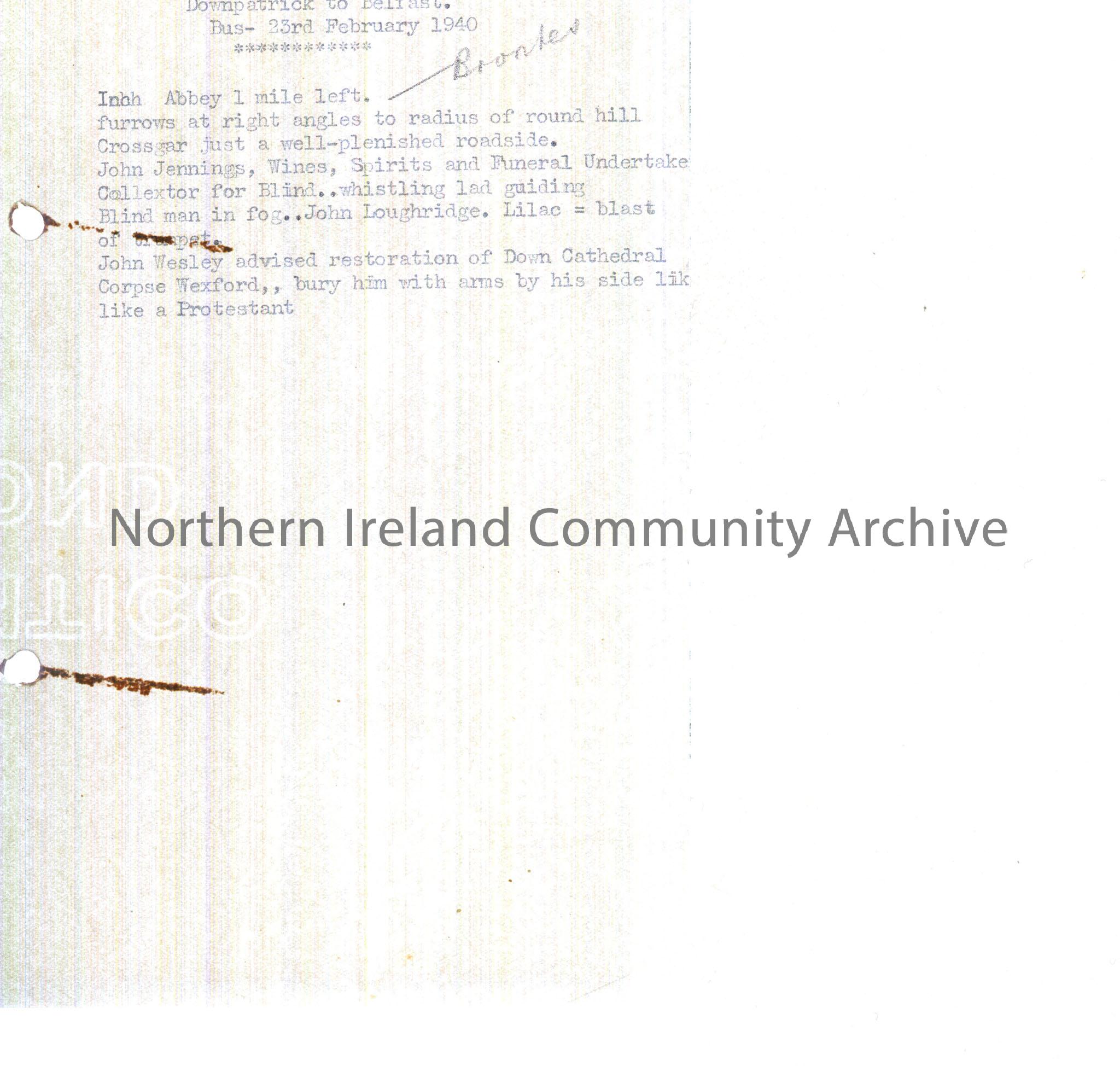Typed notes titled ‘Downpatrick to Belfast. Bus 23rd February 1940.’