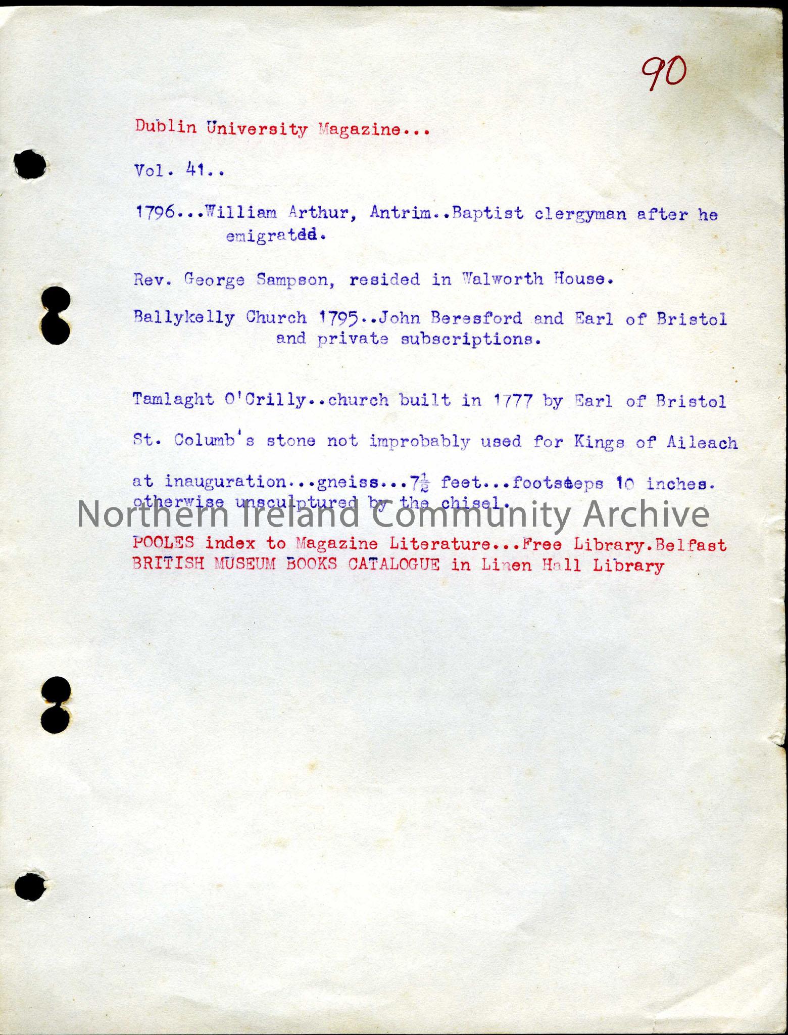 Typed notes titled ‘Dublin University Magazine’, Vol 41. William Arthur, Rev, George Sampson, Ballykelly Church 1795, St. Columb’s stone.