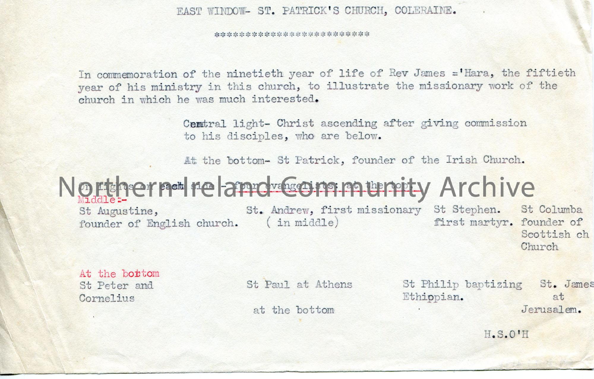 Typed notes titled, ‘East Window – St. Patrick’s Church, Coleraine’. Description of each part of the window.