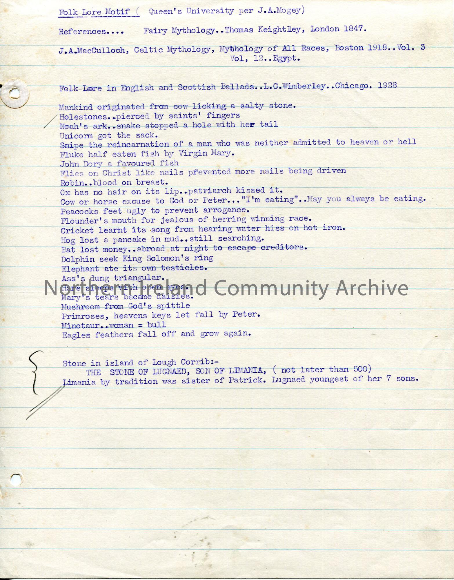 Typed notes titled, 'Folk Lore Motif. (Queen's University per J. A. Mogey) References...Fairy Mythology..Thomas Keightley, London 1847; J. A. MacCulloch, Celtic Mythology of All Races, Boston 1918..Vol. 3, Vol. 12..Egypt'. Typed list of folklore.