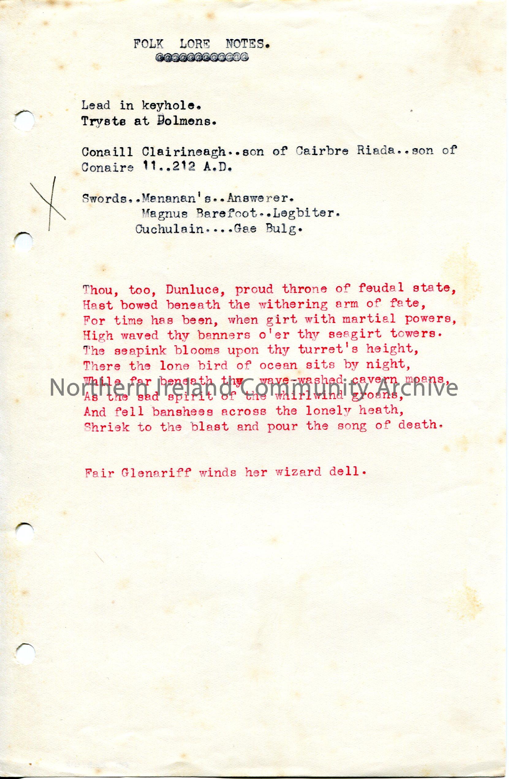 Typed notes titled, 'Folk Lore Notes'. Mentions Conaill Clairineagh, 3 swords - Mananan, Magnus Barefoot, Cuchulain. Poem (typed in red) re Dunluce castle.