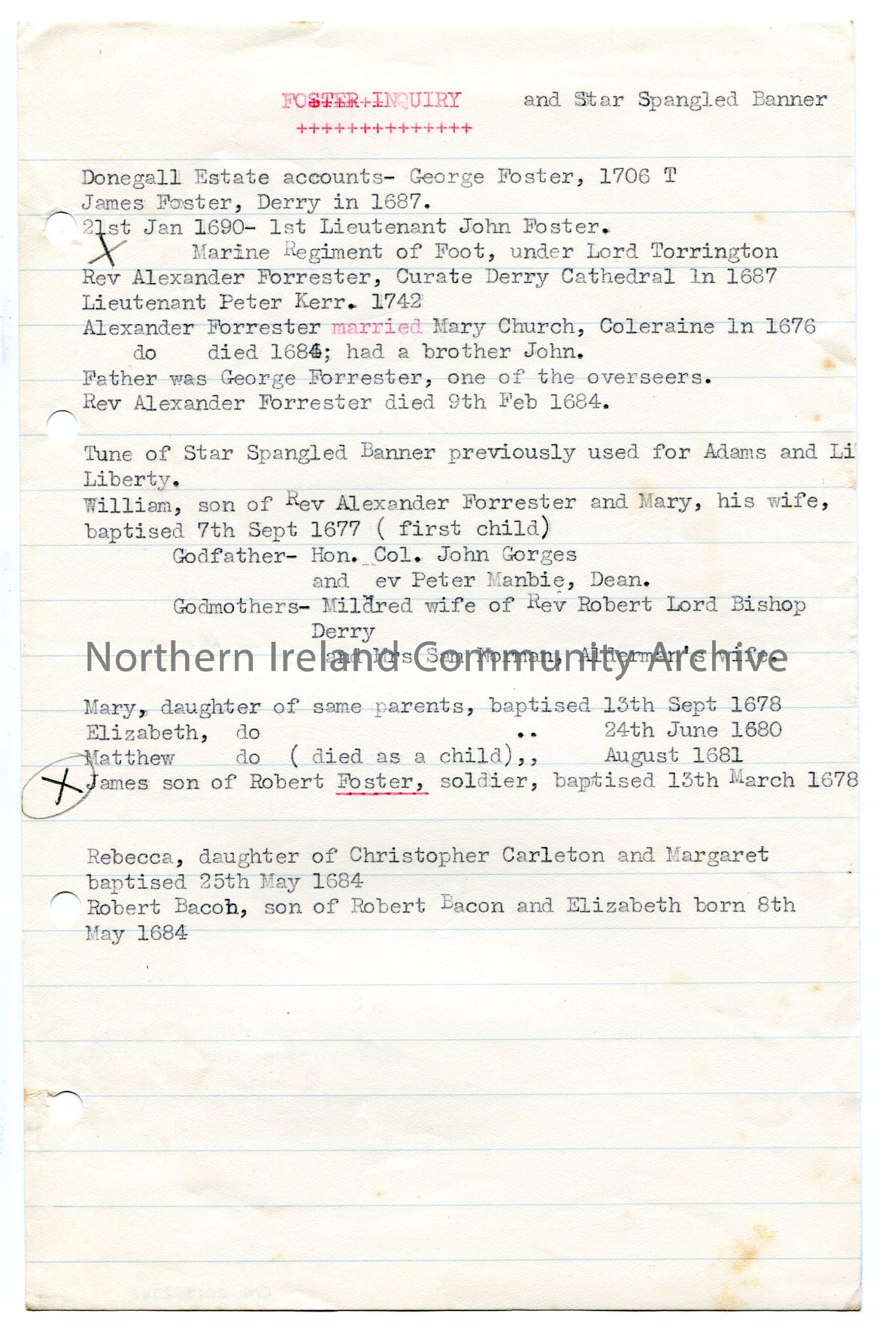 Typed notes titled, 'Foster Inquiry and Star Spangled Banner'. Genealogical research re Foster surname and connections with the song Star Spangled Banner.
