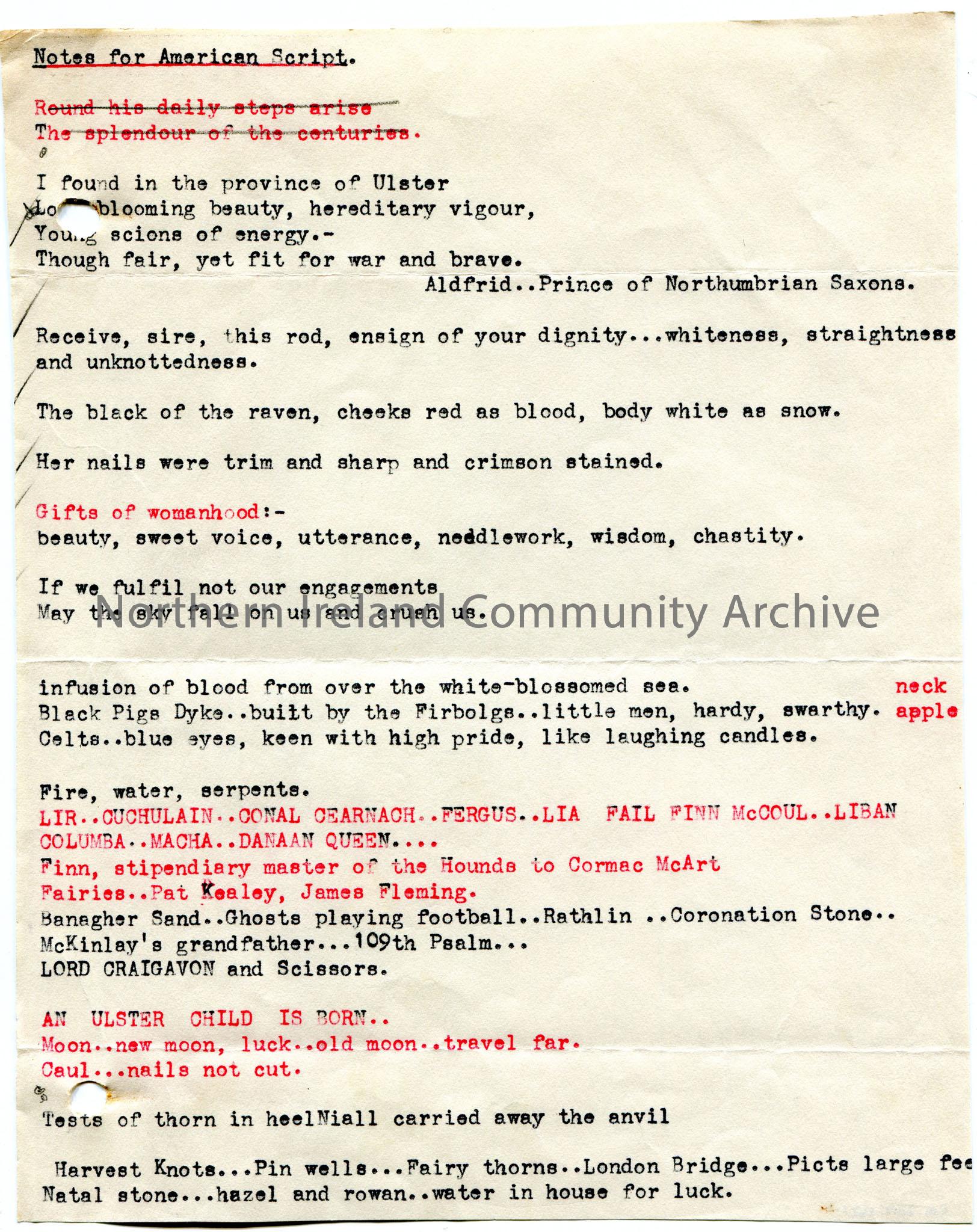 Typed notes titled, ‘Notes for American Script’. Mentions Ulster; Cuchulain; fairies; Rathlin; banshee; George O’Neill; Portglenone; Ballyronan.