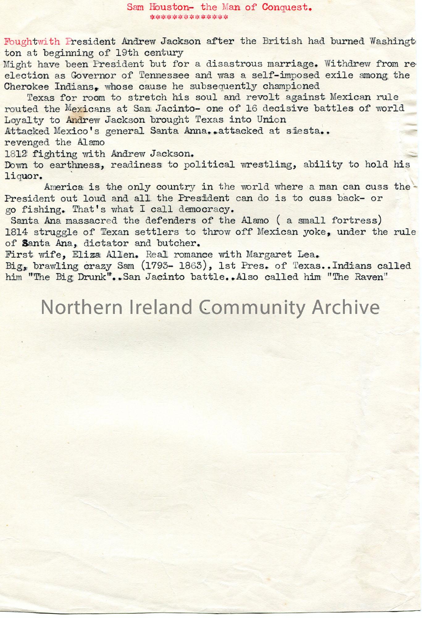 Typed notes titled, ‘Sam Houston – the Man of Conquest’. Gives details of his life in America.