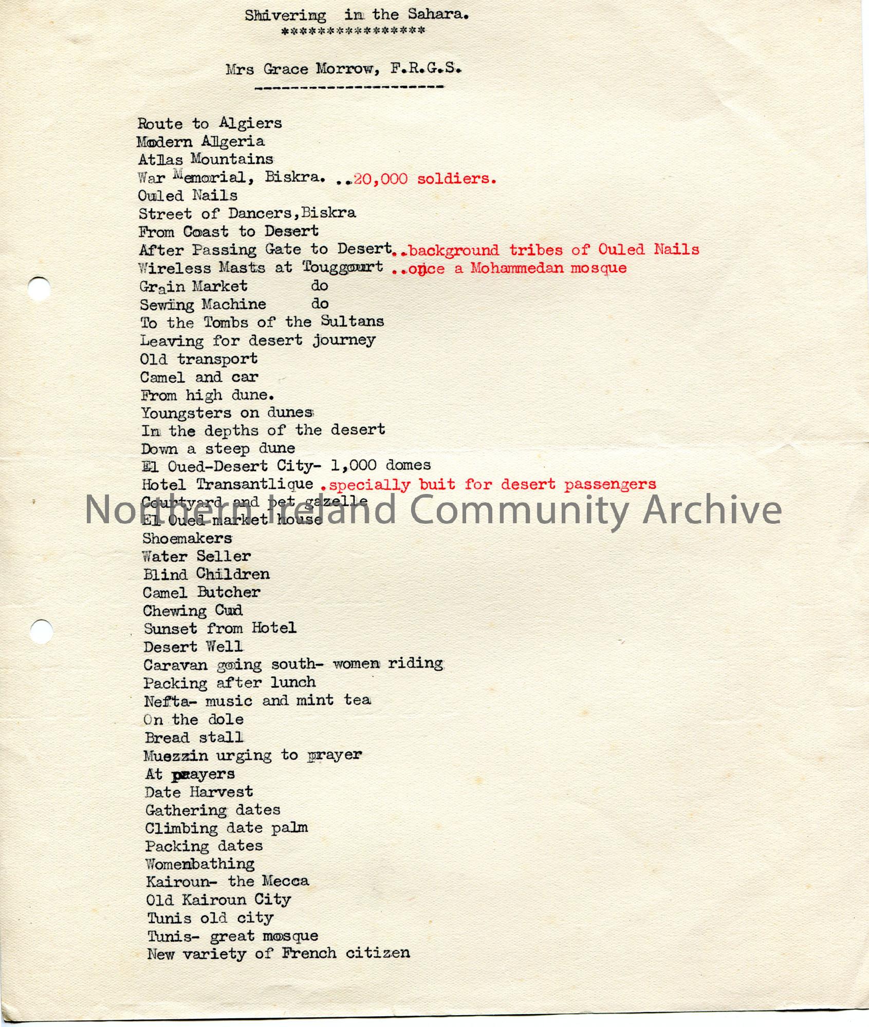 Typed notes titled, ‘Shivering in the Sahara. Mrs Grace Morrow, F.R.G.S’. Typed list of words which appear to be related to Africa.