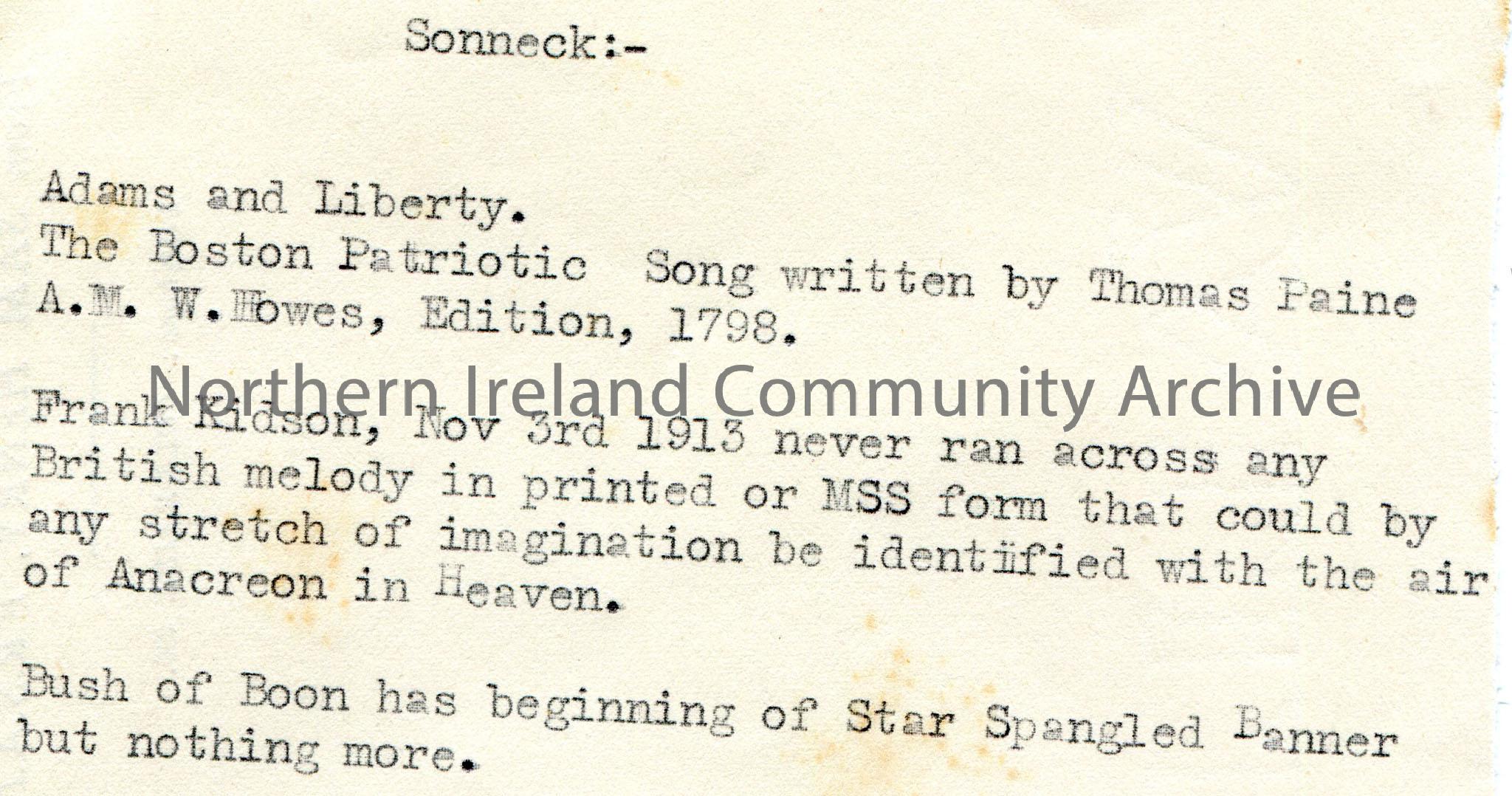 Typed notes titled, ‘Sonneck’. Re the song ‘The Star Spangled Banner’. Typed on back of Sam Henry headed paper.