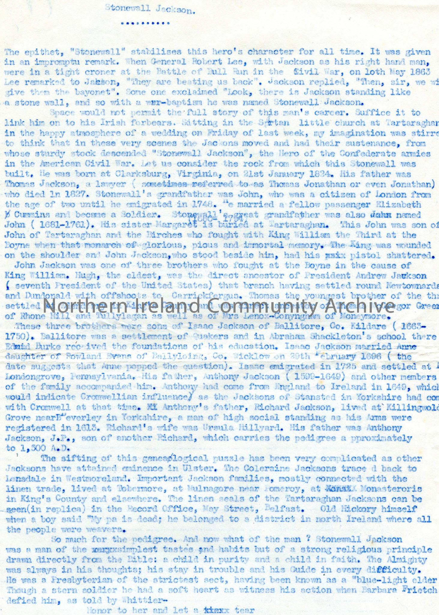 Typed notes titled, ‘Stonewall Jackson’. Re life and career of Stonewall Jackson.