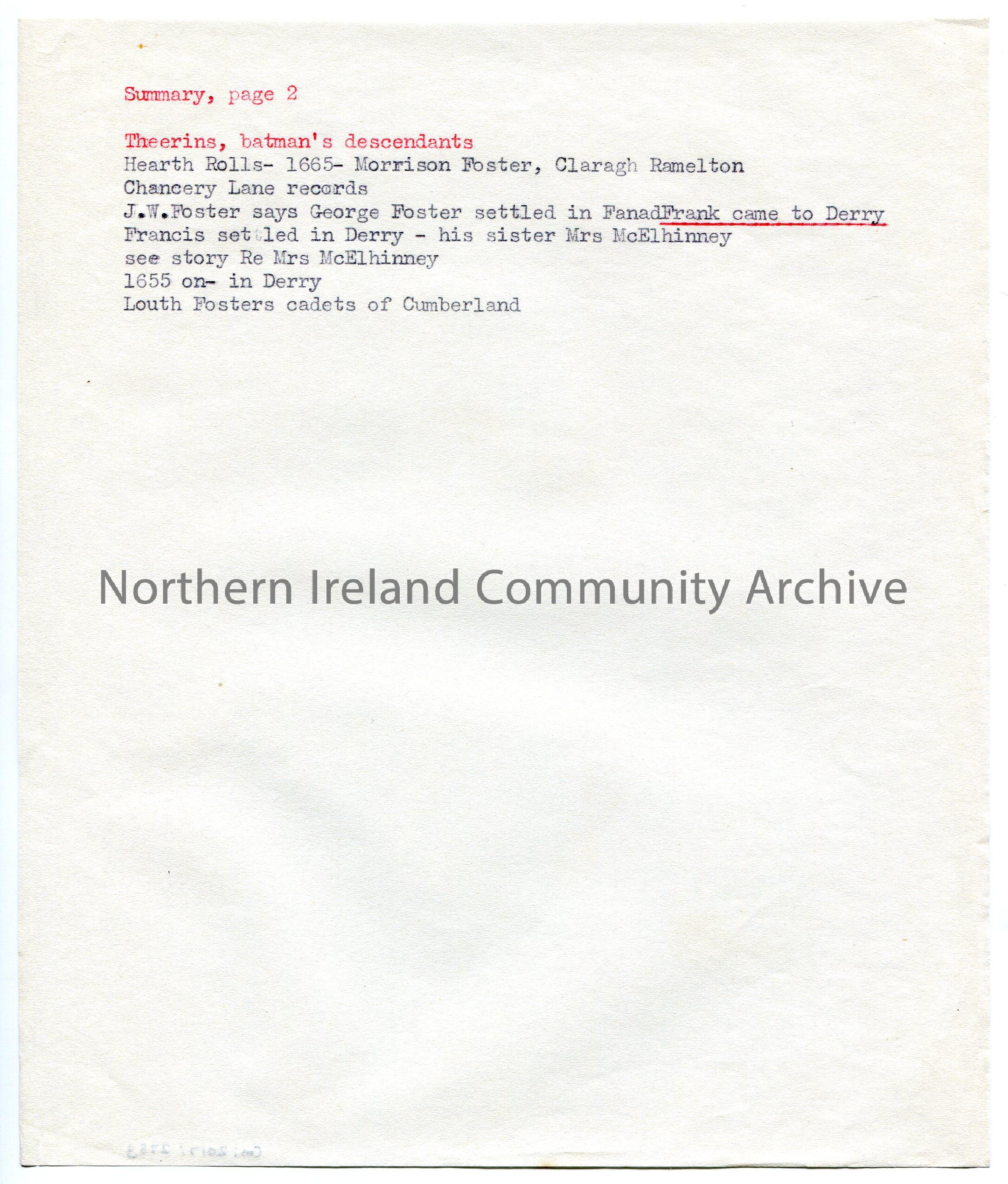 Typed notes titled, ‘Summary, page 2’. Re research of Foster family name. Mentions Hearth Rolls of 1665.