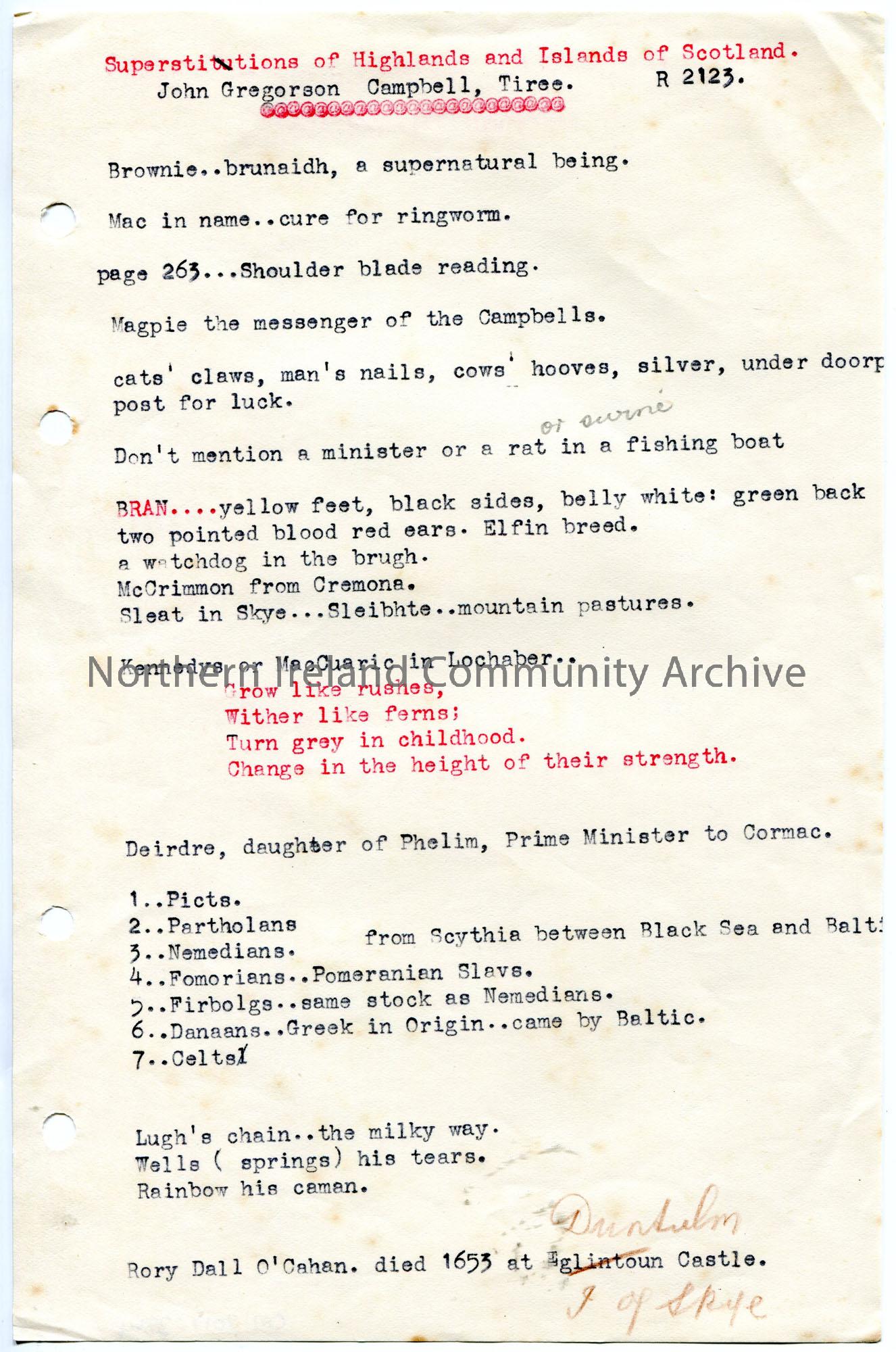 Typed notes titled, ‘Superstitions of Highlands and Islands of Scotland’. Mentions the harpist, Rory Dall O’Cahan.