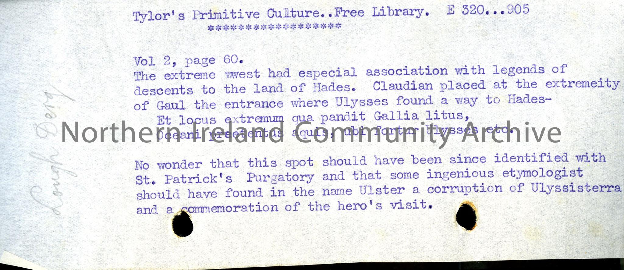 Typed notes titled, ‘Taylor’s Primitive Culture..Free Library. E 320…905’, Vol 2, page 60. Refers to the land of Hades and St. Patrick’s Purgatory.