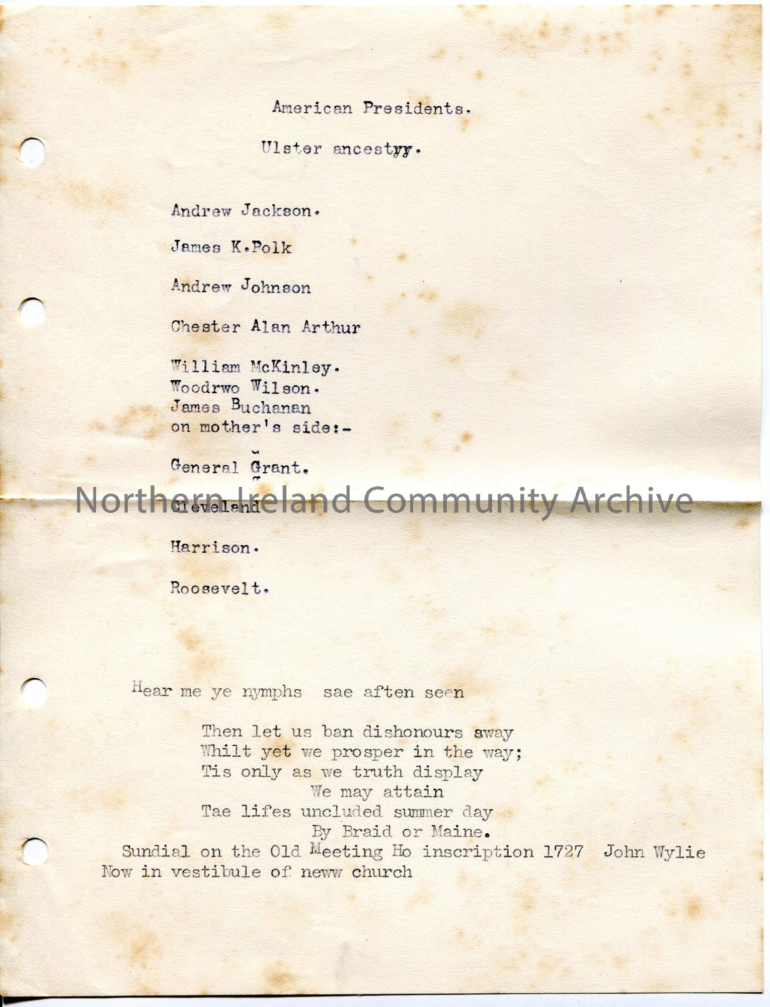 Typed notes under heading 'American Presidents - Ulster Ancestry' - list of names plus 1727 inscription from sundial on Old Meeting House (no location given but it is Cullybackey). Uses local dialect.