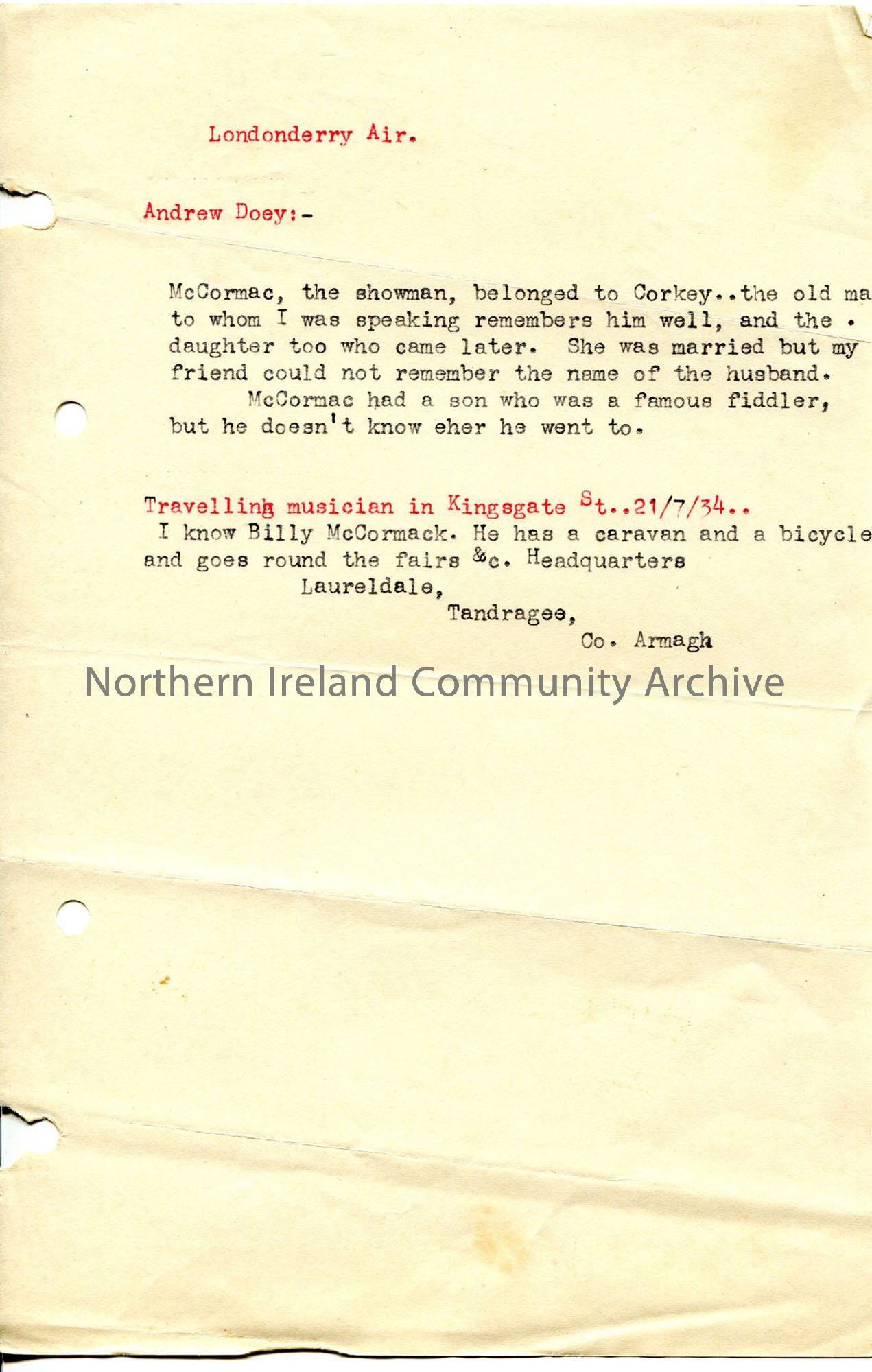 Typed notes under heading 'Londonderry Air', about McCormac (elsewhere spelt McCormick) - the fiddler from whom the tune was first noted - from 2 sources.