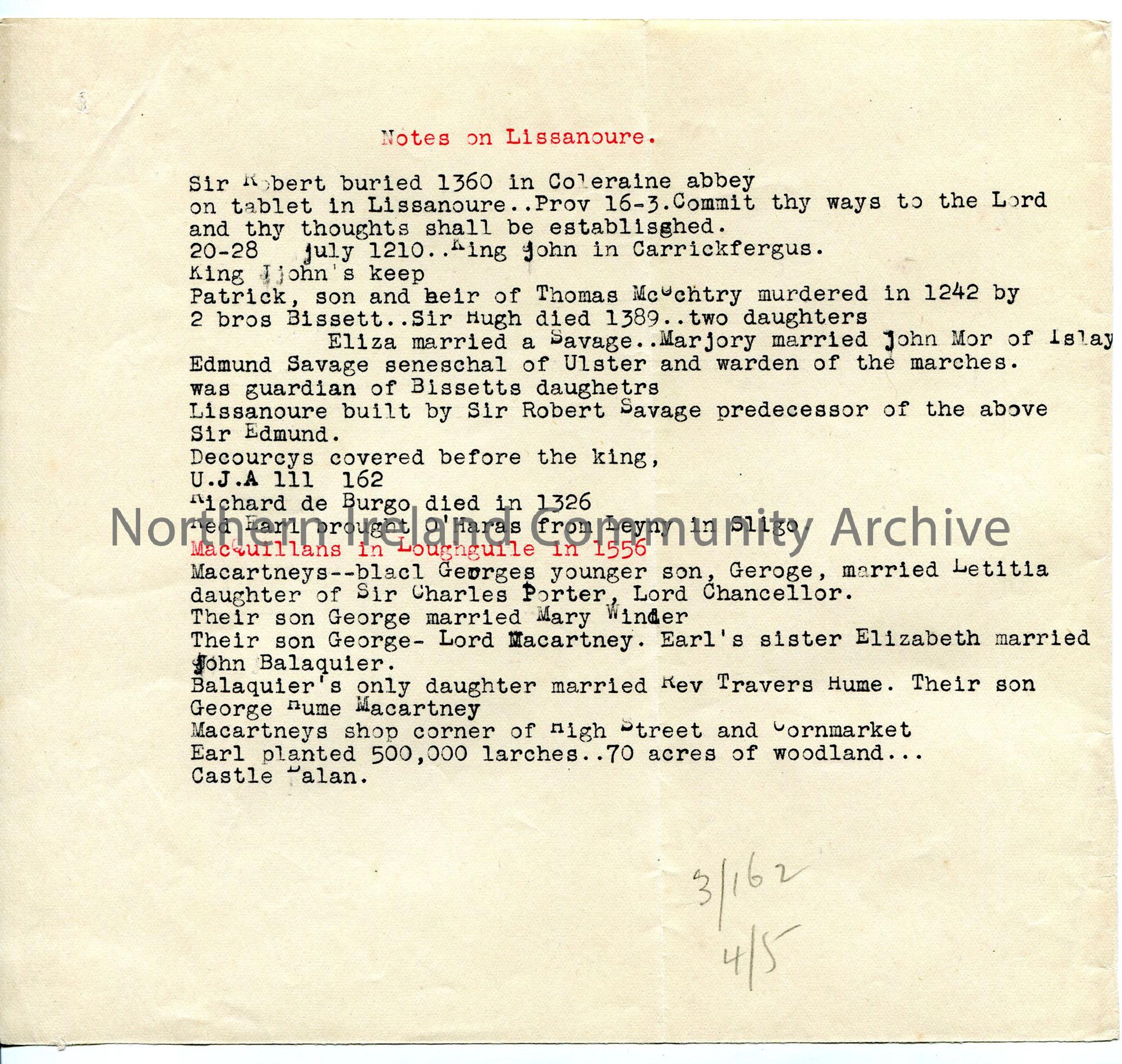 Typed notes under heading ‘Notes on Lissanoure’ – Bissetts (marriage to John Mor of Islay), Savages, MacQuillans – and then McCartney family line