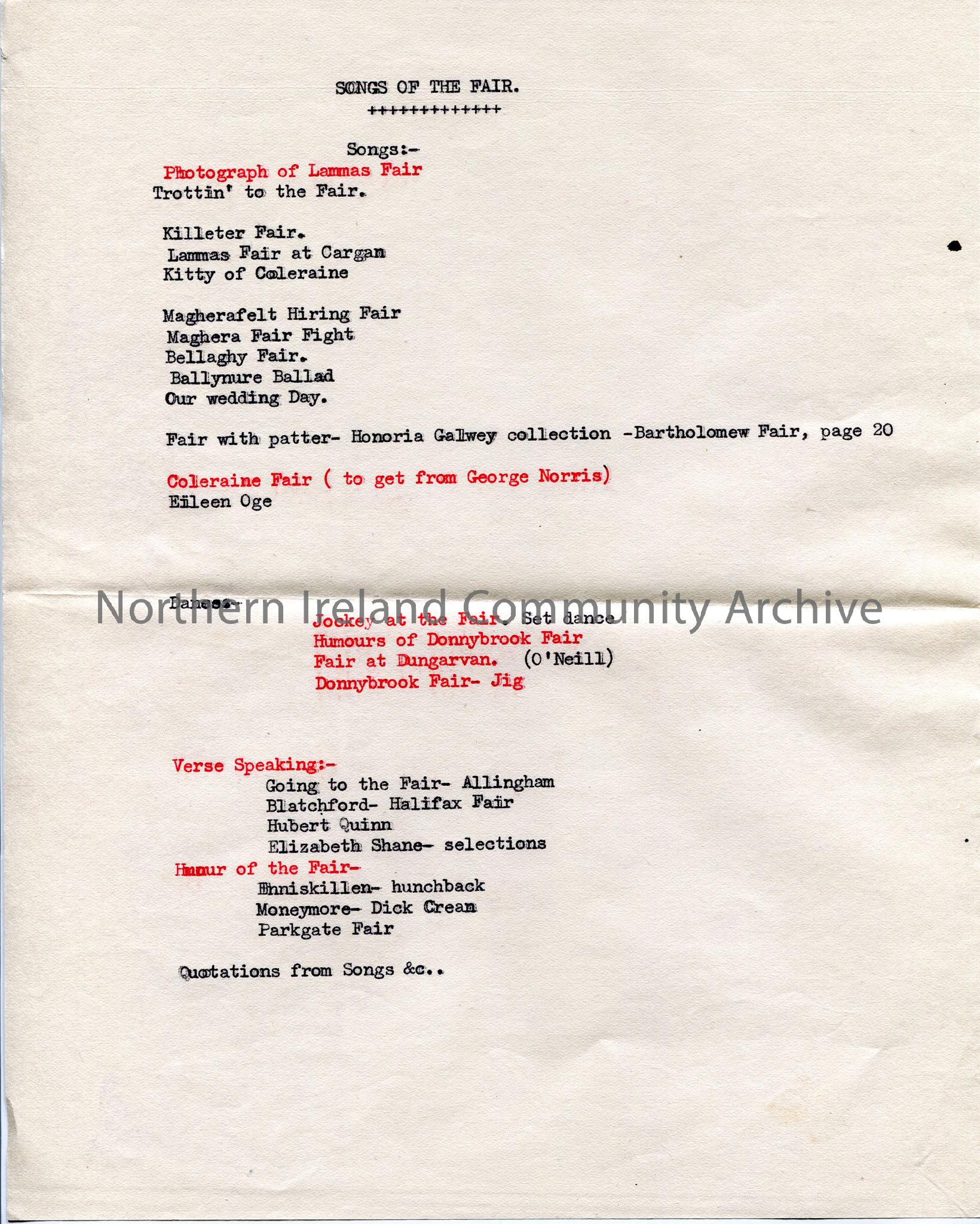 Typed notes under heading ‘Songs of the Fair’ – – titles only of songs about various fairs