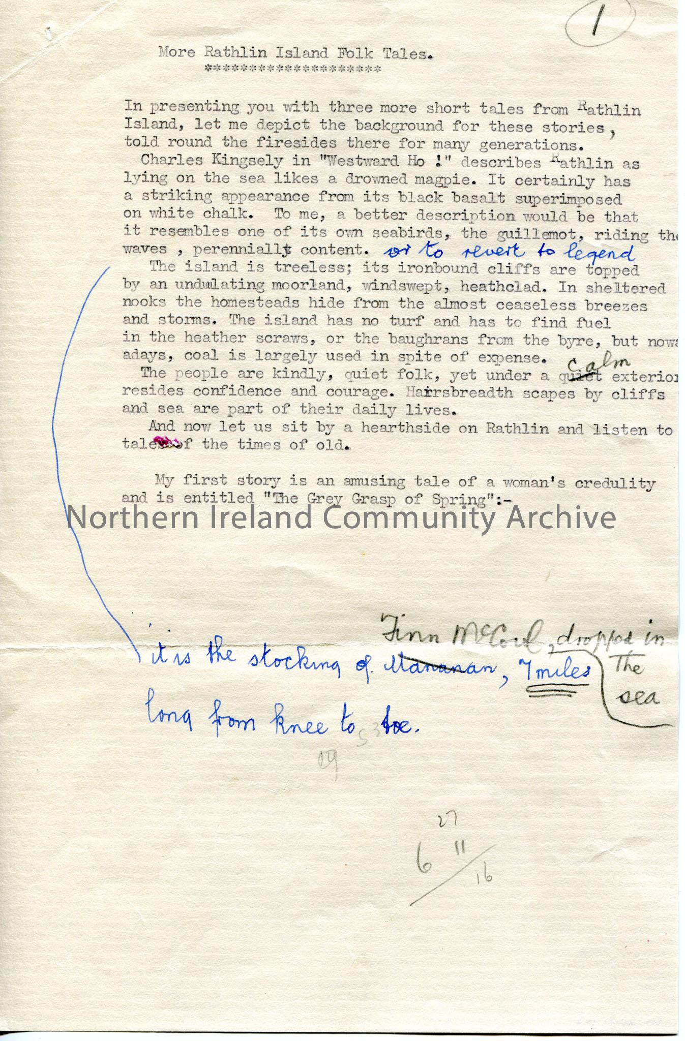 Typed notes which are annotated, possibly the beginning of a script for broadcast. Titled, ‘More Rathlin Island Folk Tales.’ Give a description of the…