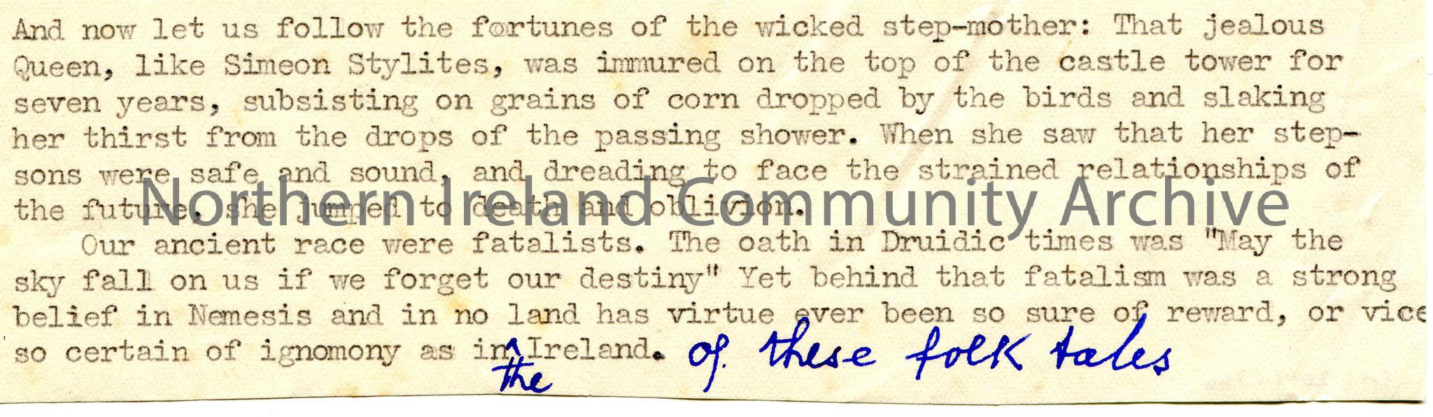 Typed notes which are possibly the beginning of a script for broadcast. Re short story of a wicked step-mother. Refers to Druid beliefs.