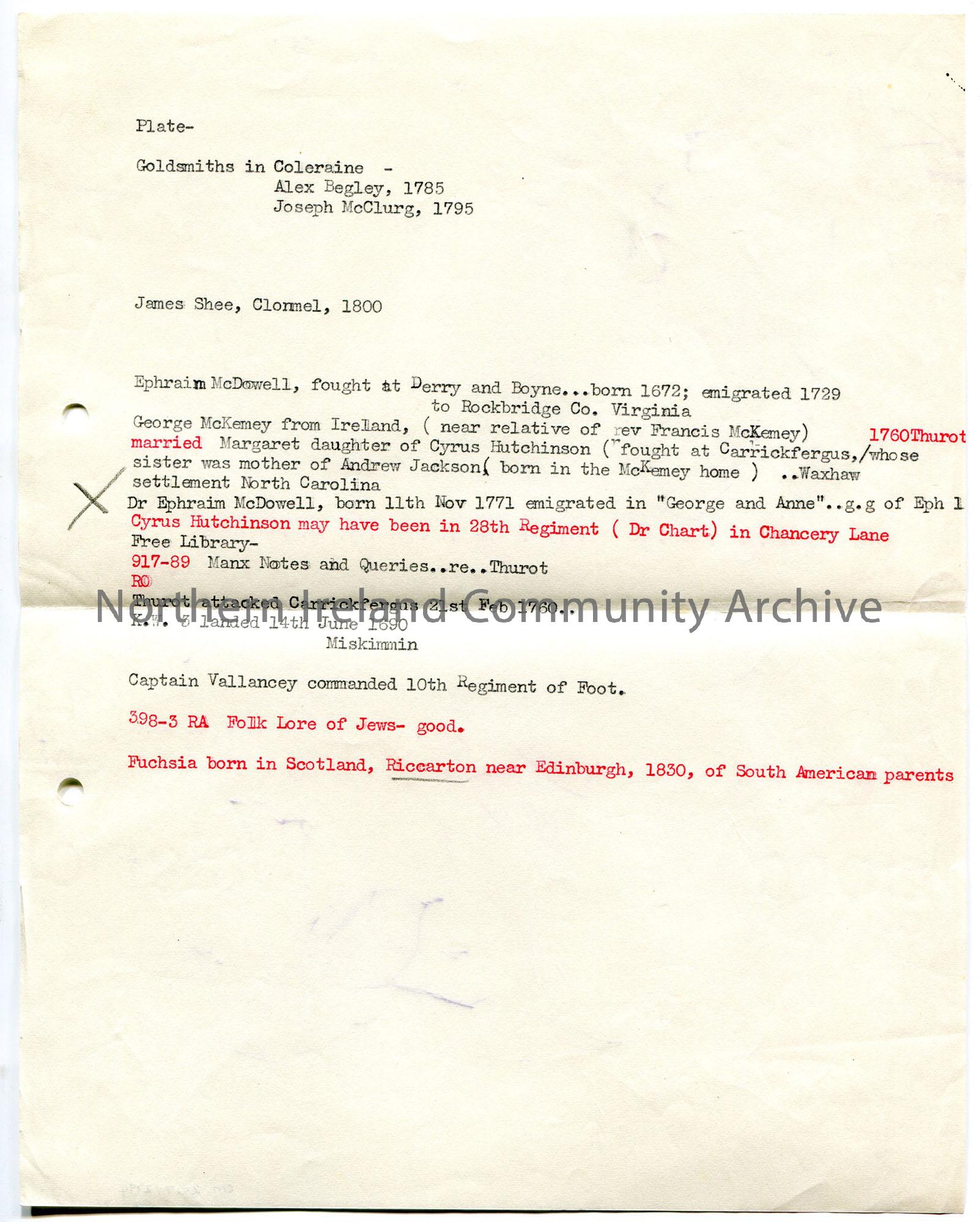 Typed notes which mention goldsmiths in Coleraine – Alex Begley, 1785 and Joseph McClurg, 1795. Other notes are genealogical notes re Ephraim McDowell…