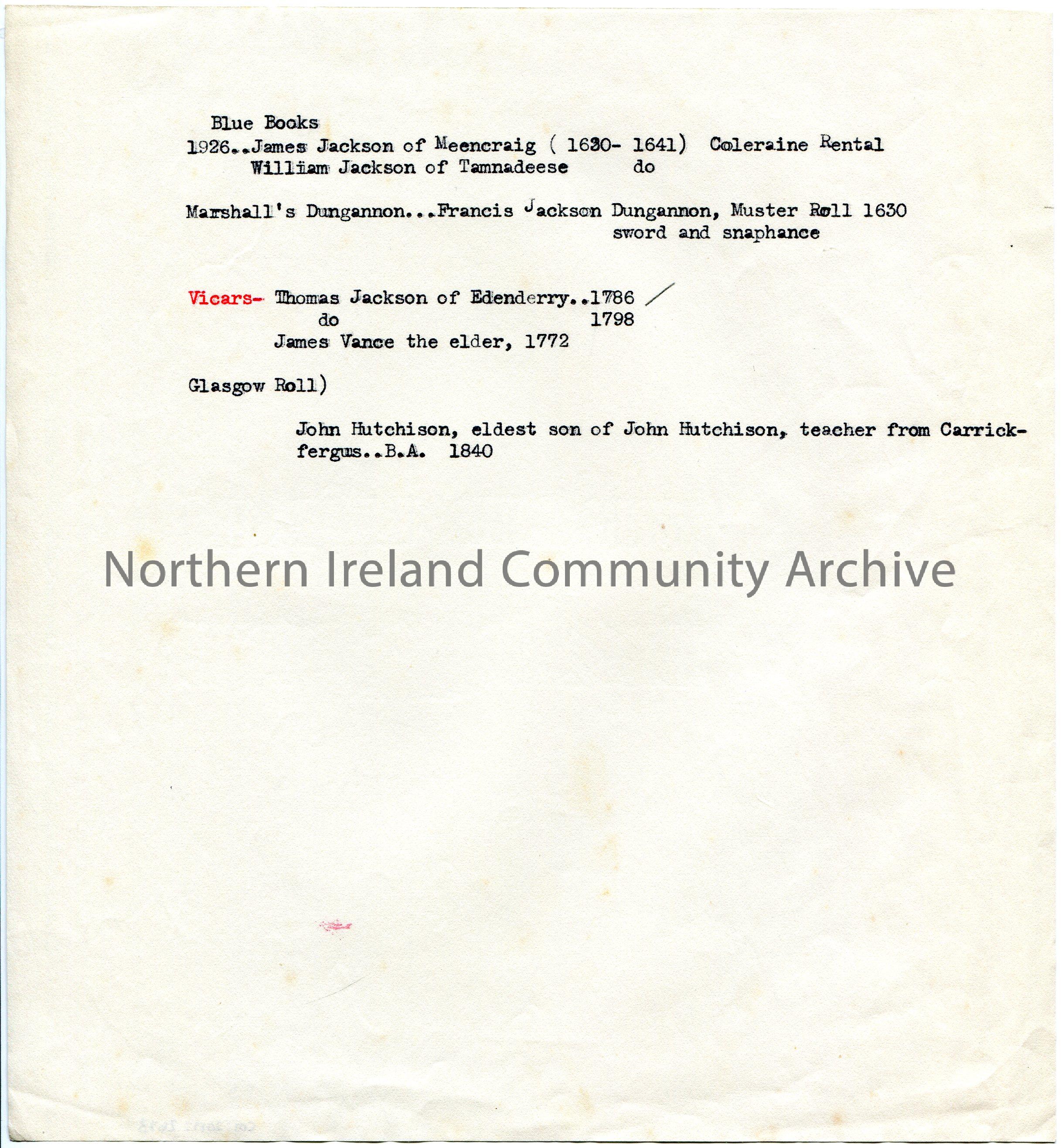 Typed notes which mention James Jackson of Meencraig, Francis Jackson of Dungannon, Thomas Jackson of Edenderry, James Vance, elder and John Hutchison.