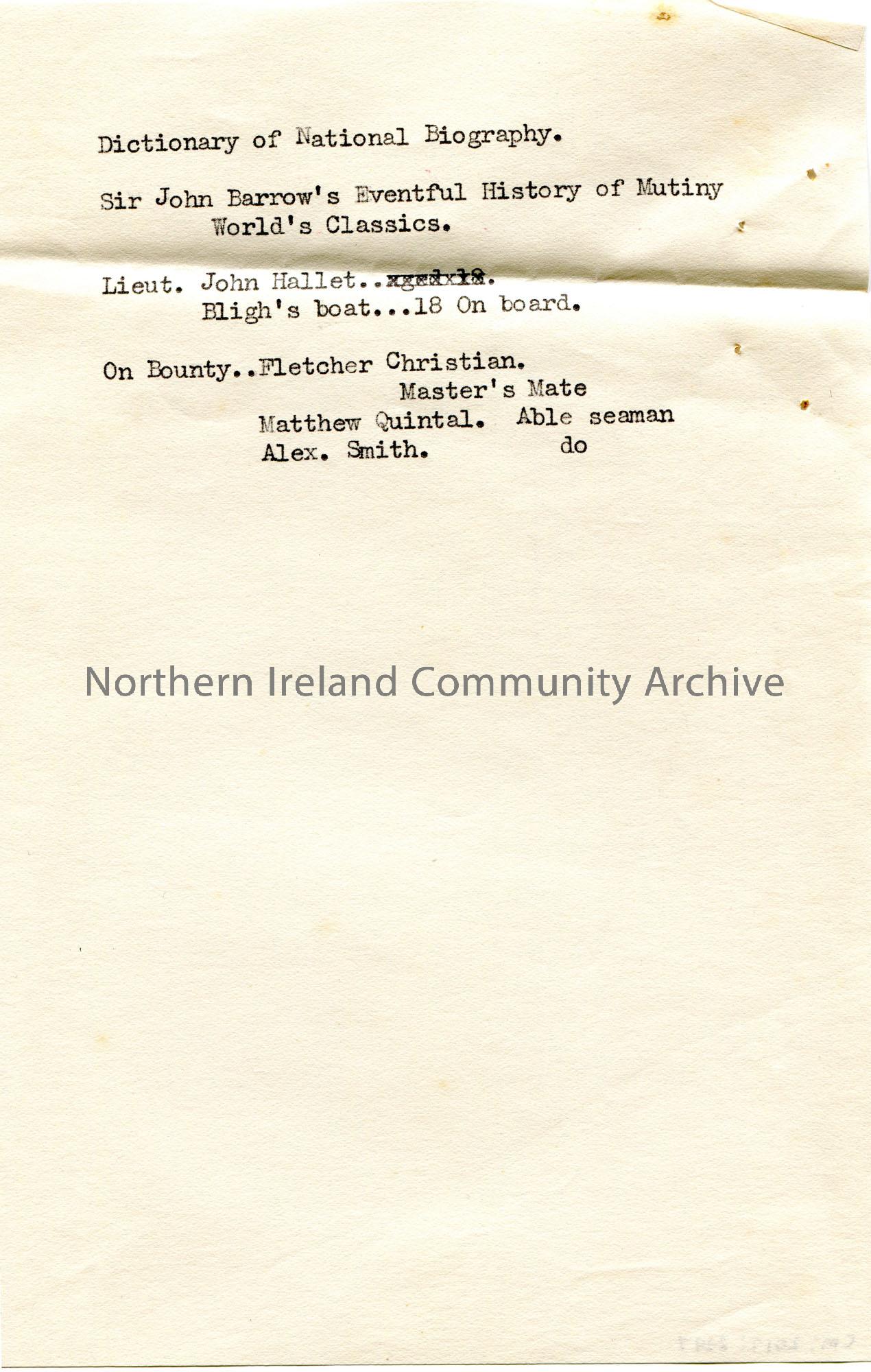 Typed notes/list of references. Headed as ‘Dictionary of National Biography’.