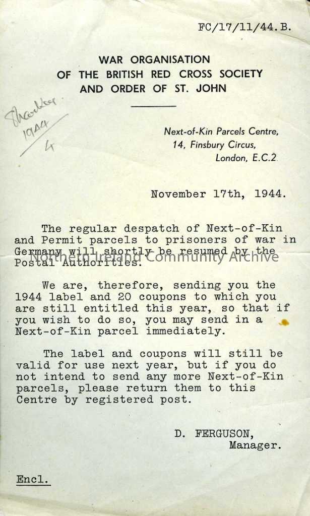 Typed notice on headed paper - "War Organisation of the British Red Cross Society and Order of St John", dated 17th November 1944 and from D.Ferguson, manager of the Next-of-Kin Parcels Centre. The letter was sent with the 1944 label and 20 coupons.