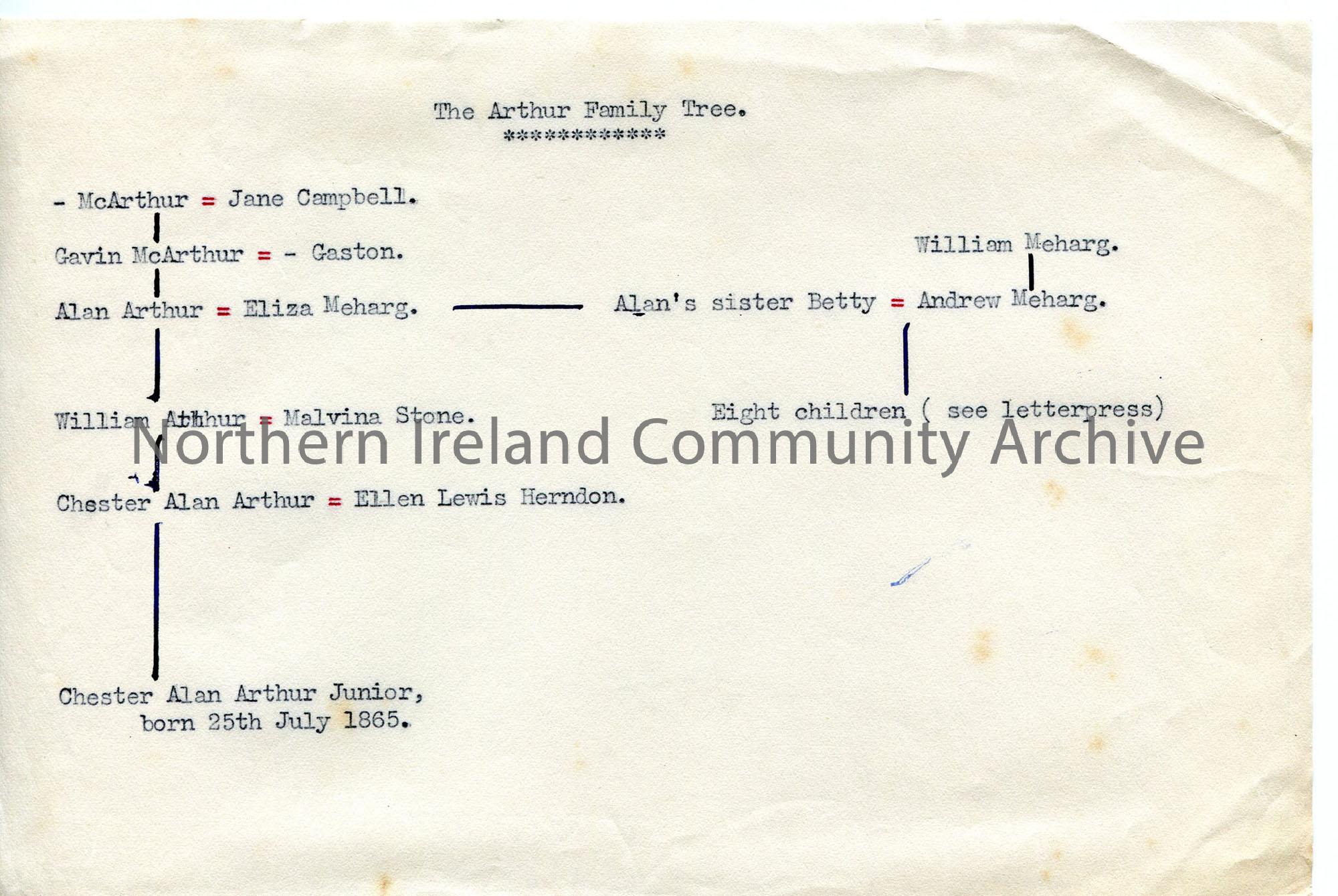 Typed outline of 'The Arthur family Tree' - direct family line from Great-great-grandparents on paternal side