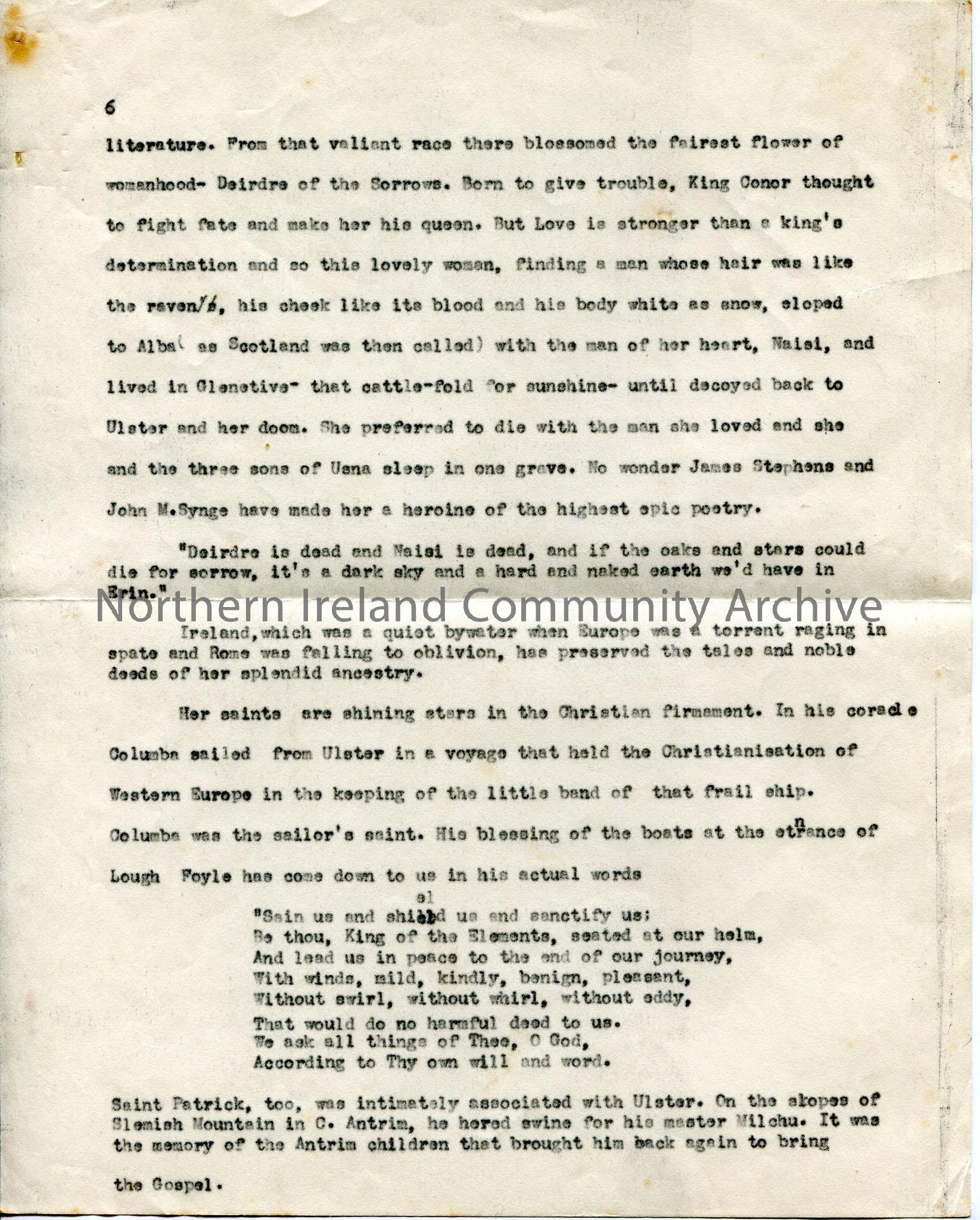 Typed page, numbered 6. This appears to be alternative version of page 5 of script for broadcast ‘Old Customs and Legends of Ulster’