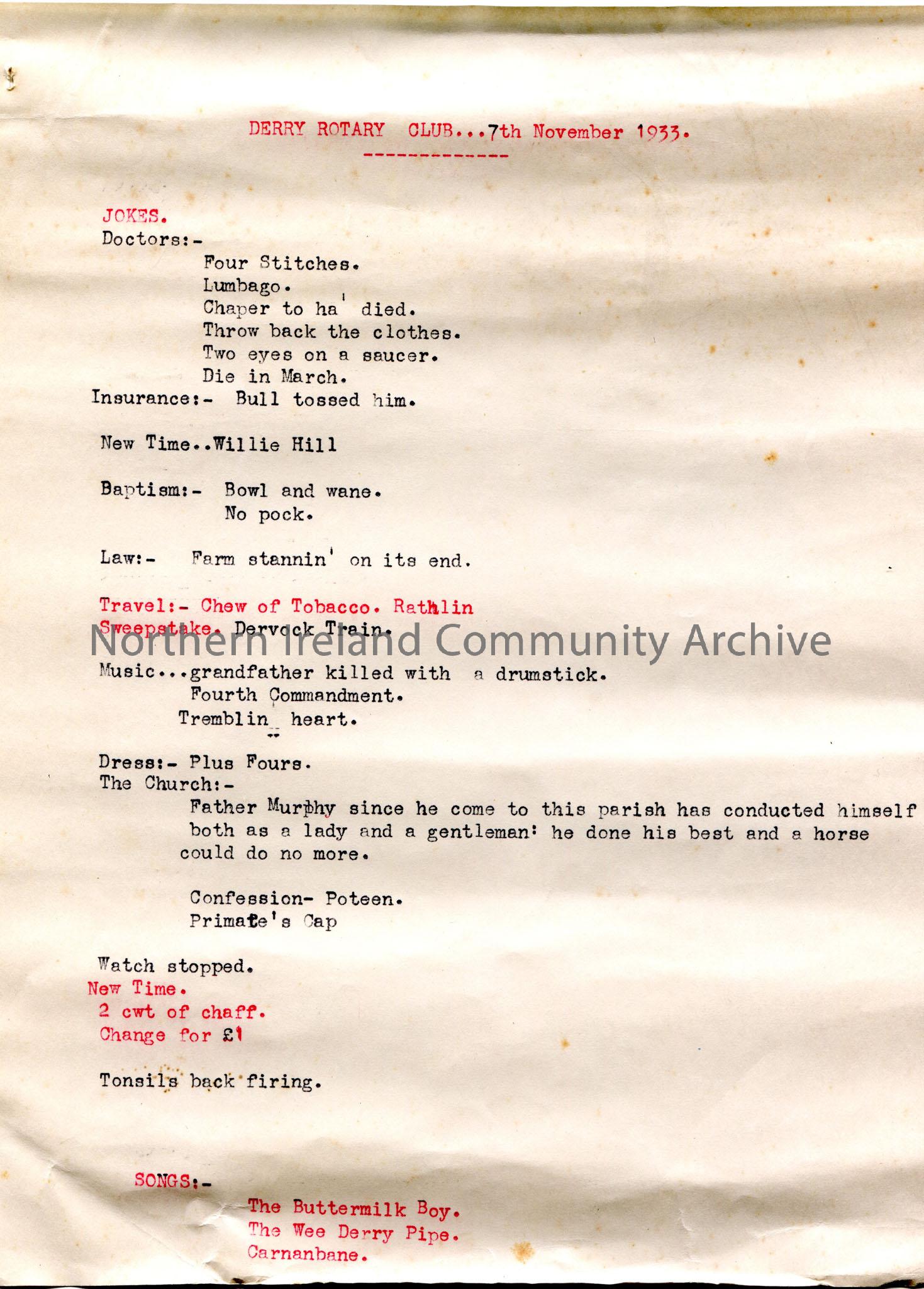 Typed page of notes for talk at Derry Rotary Club on 7th November, 1933. Mentions jokes and songs.