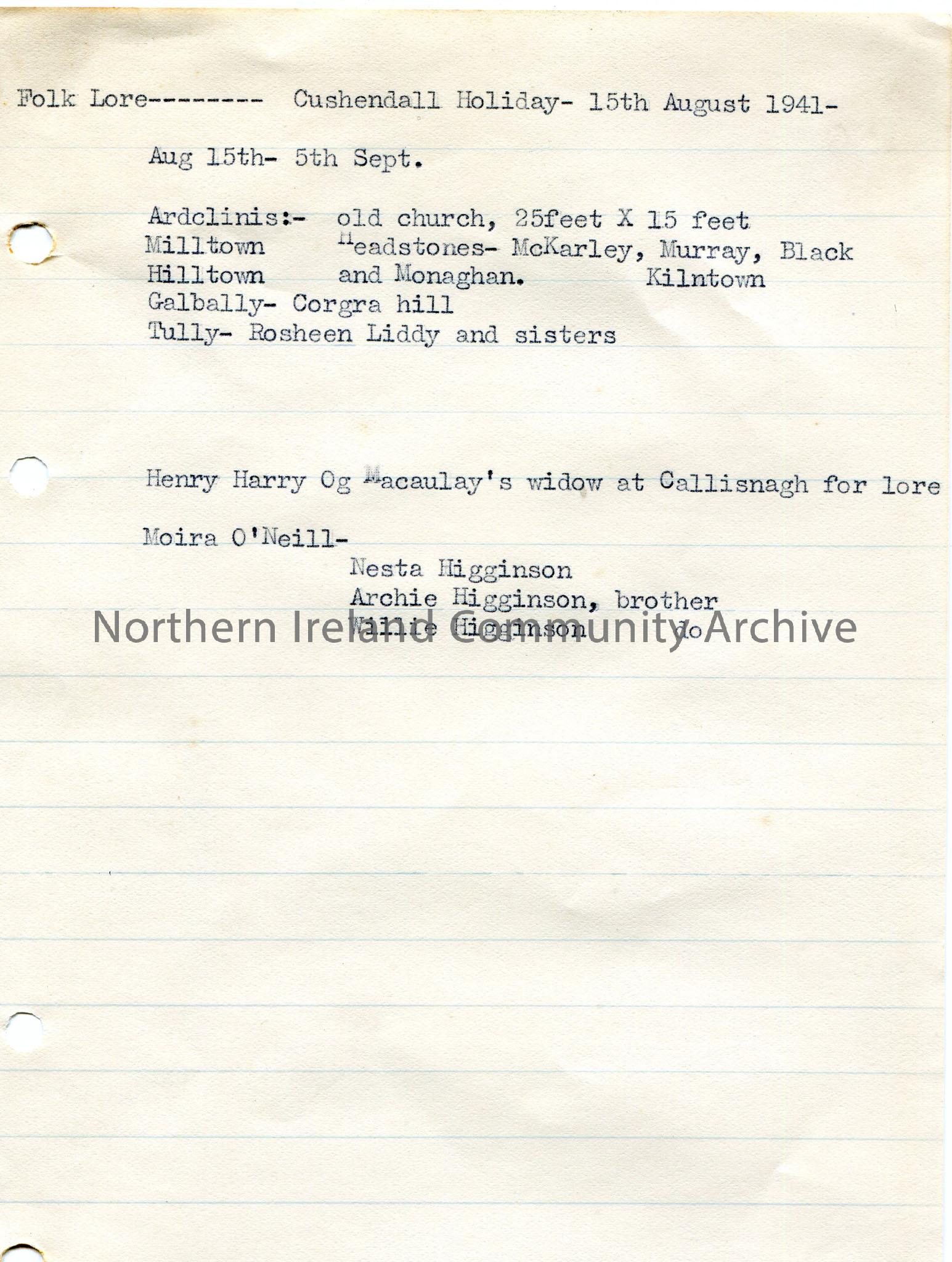 Typed page of notes on lined paper re folk lore. Cushendall Holiday on 15th August 1941. Mentions Ardclinis, Milltown, Hilltown, Galbally, Tully, Higginson family name.