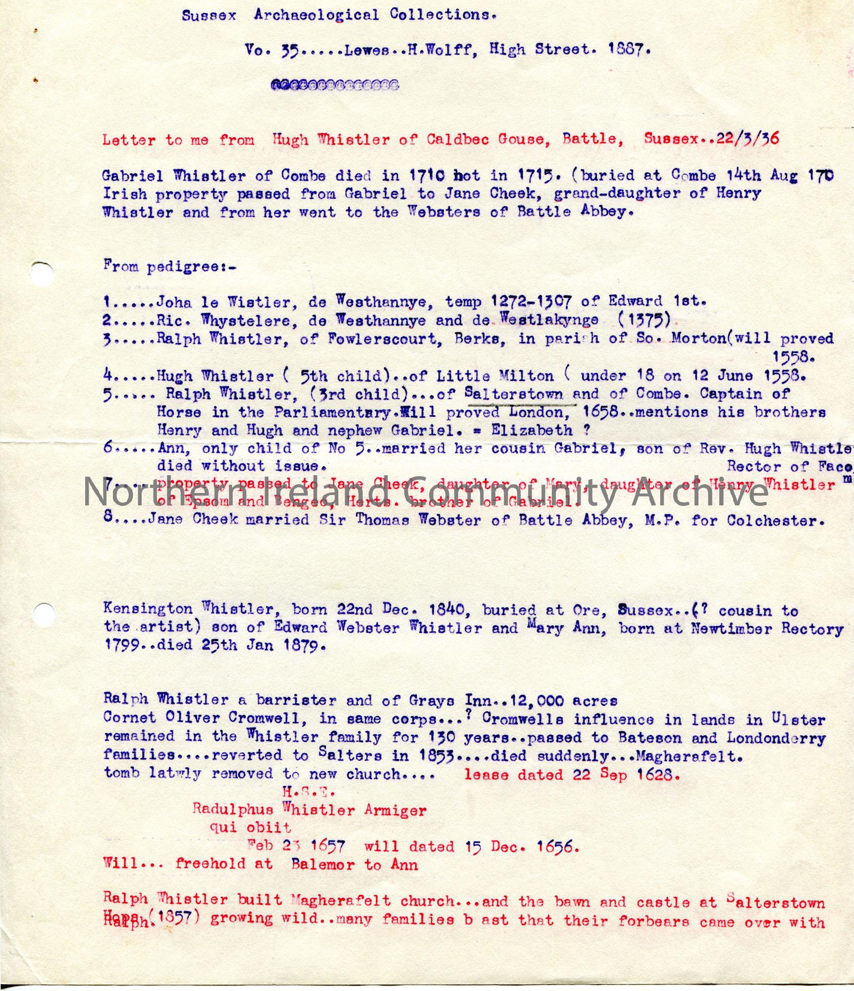 Typed page of notes re Whistler lineage. Some notes are typed in red.